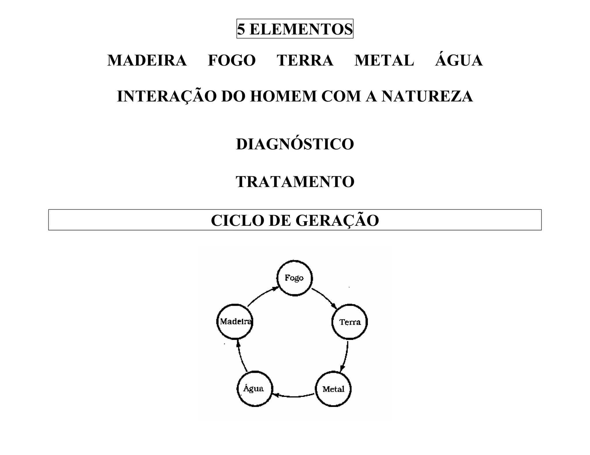 O documento discute a teoria dos Cinco Elementos da medicina tradicional chinesa. Ele lista os cinco elementos - Madeira, Fogo, Terra, Metal e Água - e descreve suas correspondências com órgãos, emoções, estações do ano e outros aspectos. O texto também aborda os ciclos de geração e controle entre os elementos e como equilibrá-los no diagnóstico e tratamento de doenças.