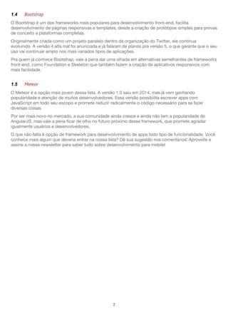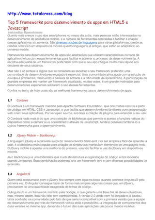 O documento discute os principais frameworks para desenvolvimento de aplicativos móveis em HTML5 e JavaScript, listando Cordova, JQuery Mobile + Backbone.js, AngularJS, Bootstrap e Meteor como as cinco principais opções.