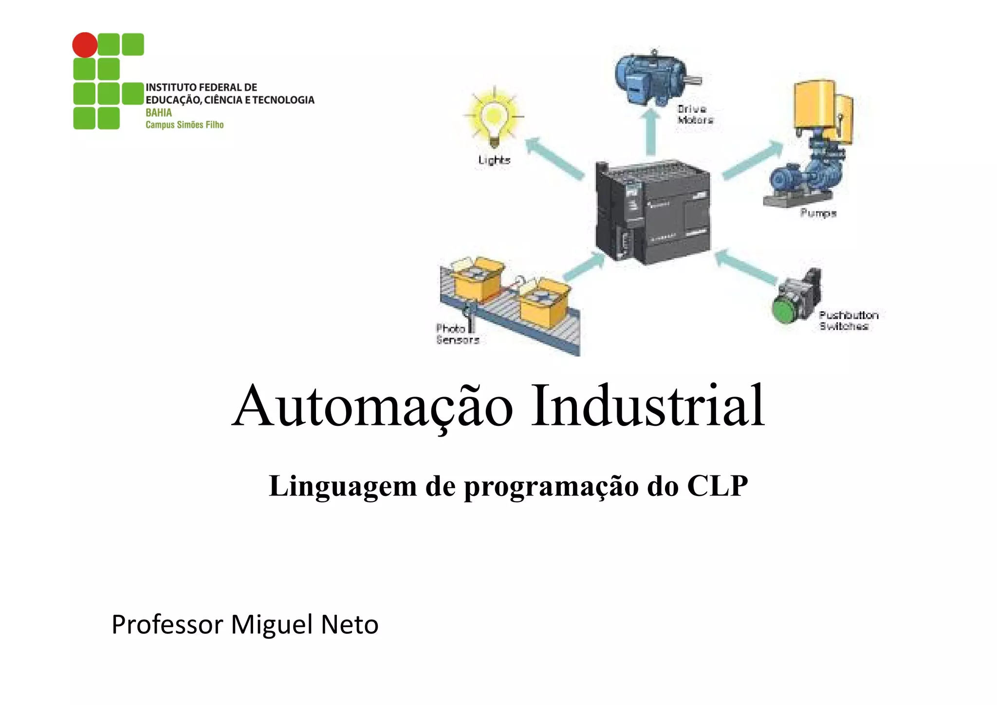 O documento discute as linguagens de programação para PLCs definidas pela norma IEC 61131-3, incluindo Diagrama de Blocos de Funções, Sequenciamento Gráfico de Funções, Lista de Instruções e Texto Estruturado. Também descreve a linguagem Ladder, incluindo sua estrutura básica, simbologia, detecção de eventos e utilização de chaves externas.