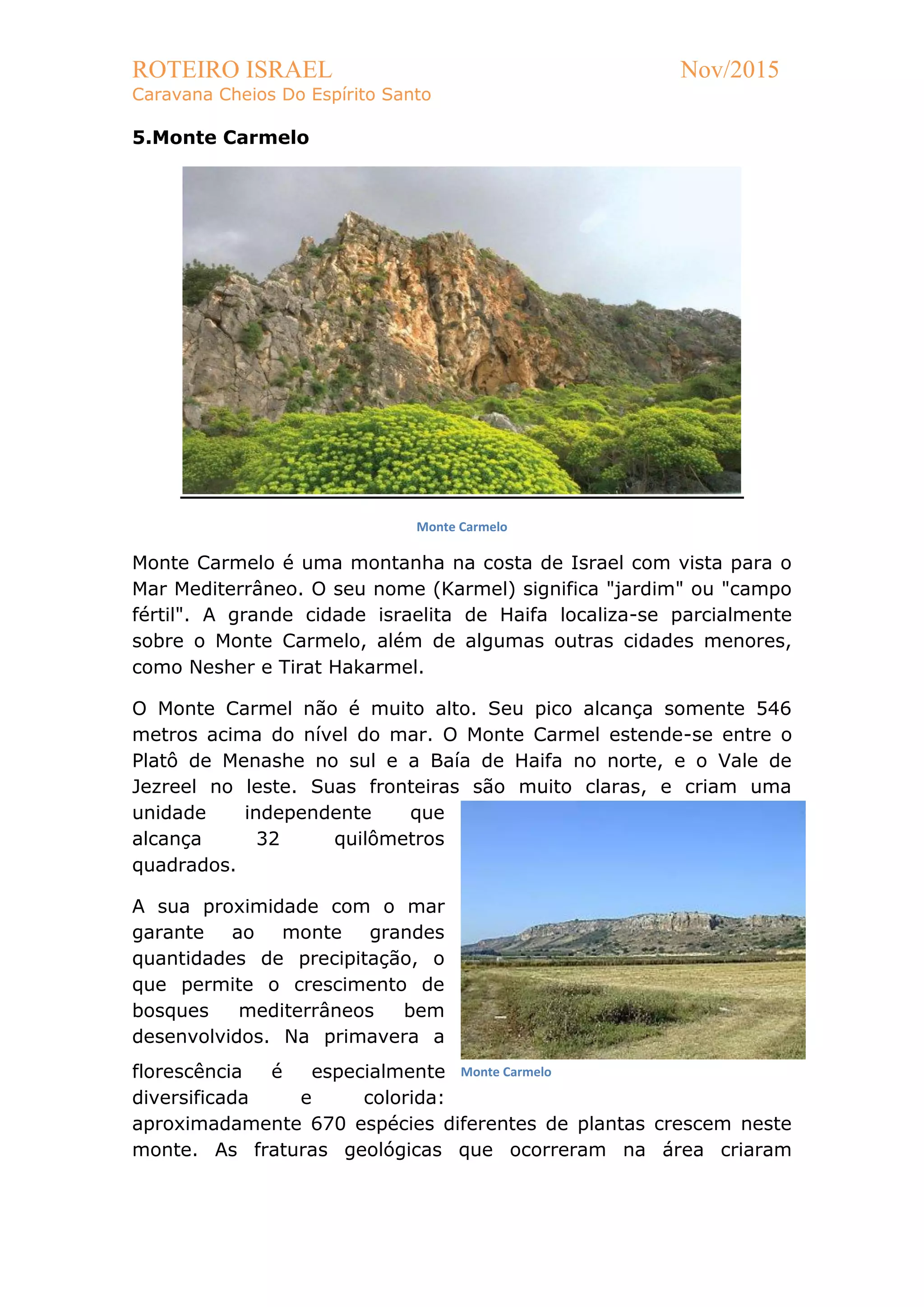 O Monte Carmelo é uma montanha na costa de Israel com vista para o Mar Mediterrâneo. É mais conhecido como o local onde o profeta Elias desafiou os profetas de Baal em nome de Deus, resultando na descida de fogo do céu para queimar o sacrifício de Elias. O Monte Carmelo também simboliza a beleza na Bíblia e é o local de uma reserva natural que revela o estilo de vida do homem pré-histórico.