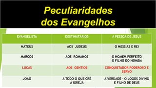 O documento fornece um resumo das principais características do Evangelho de Lucas, incluindo seu autor Lucas, destinatários gentios, e apresentação de Jesus como o Homem Perfeito. Ele também discute os temas centrais, estrutura e lições do livro.