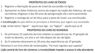 1) O documento resume os livros bíblicos de Êxodo e Números, que registram a libertação do povo hebreu da escravidão no Egito e sua peregrinação no deserto.