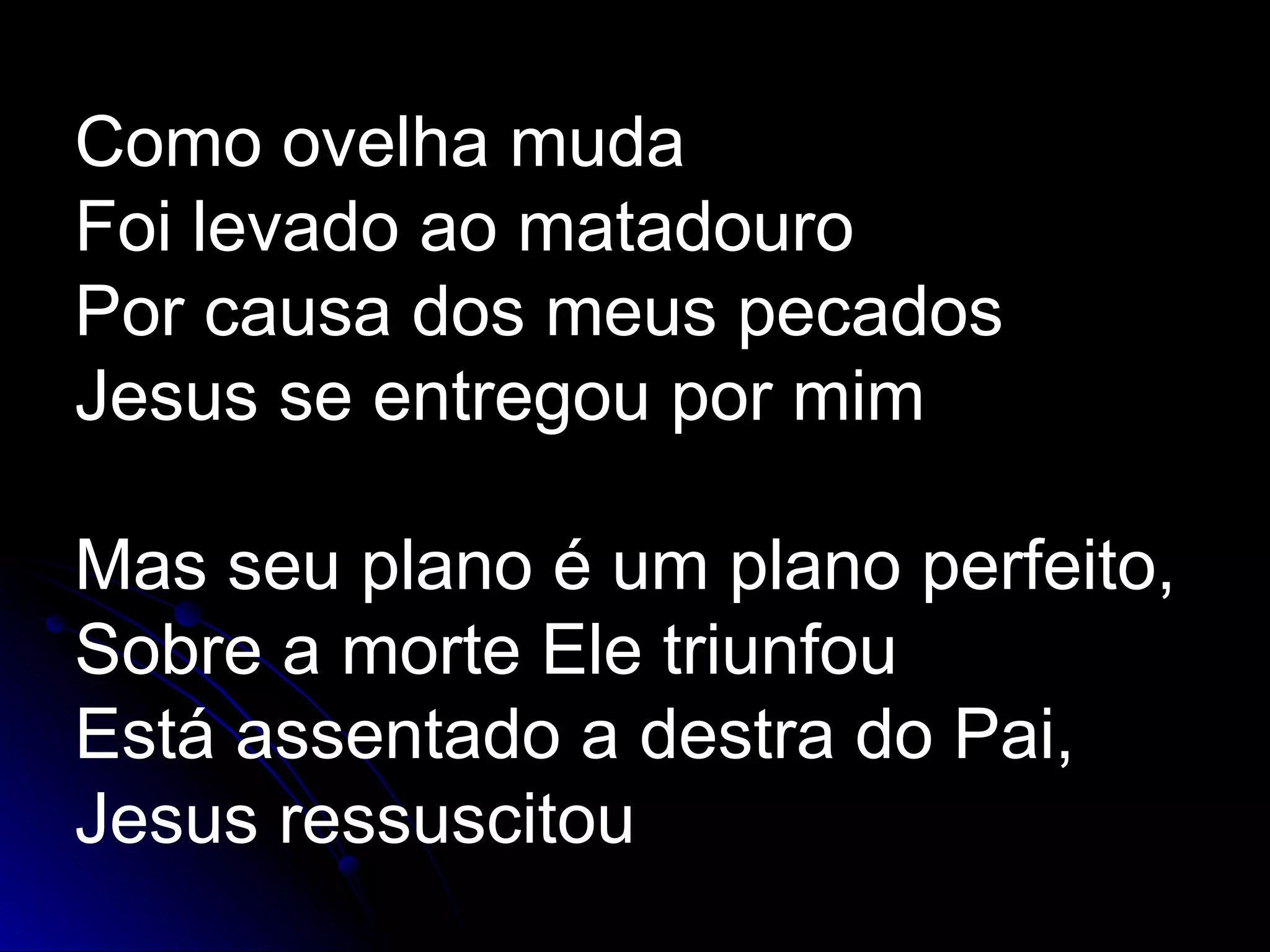 Como ovelha mudaFoi levado ao matadouro Por causa dos meus pecados Jesus se entregou por mim Mas seu plano é um plano perfeito, Sobre a morte Ele triunfou Está assentado a destra do Pai, Jesus ressuscitou