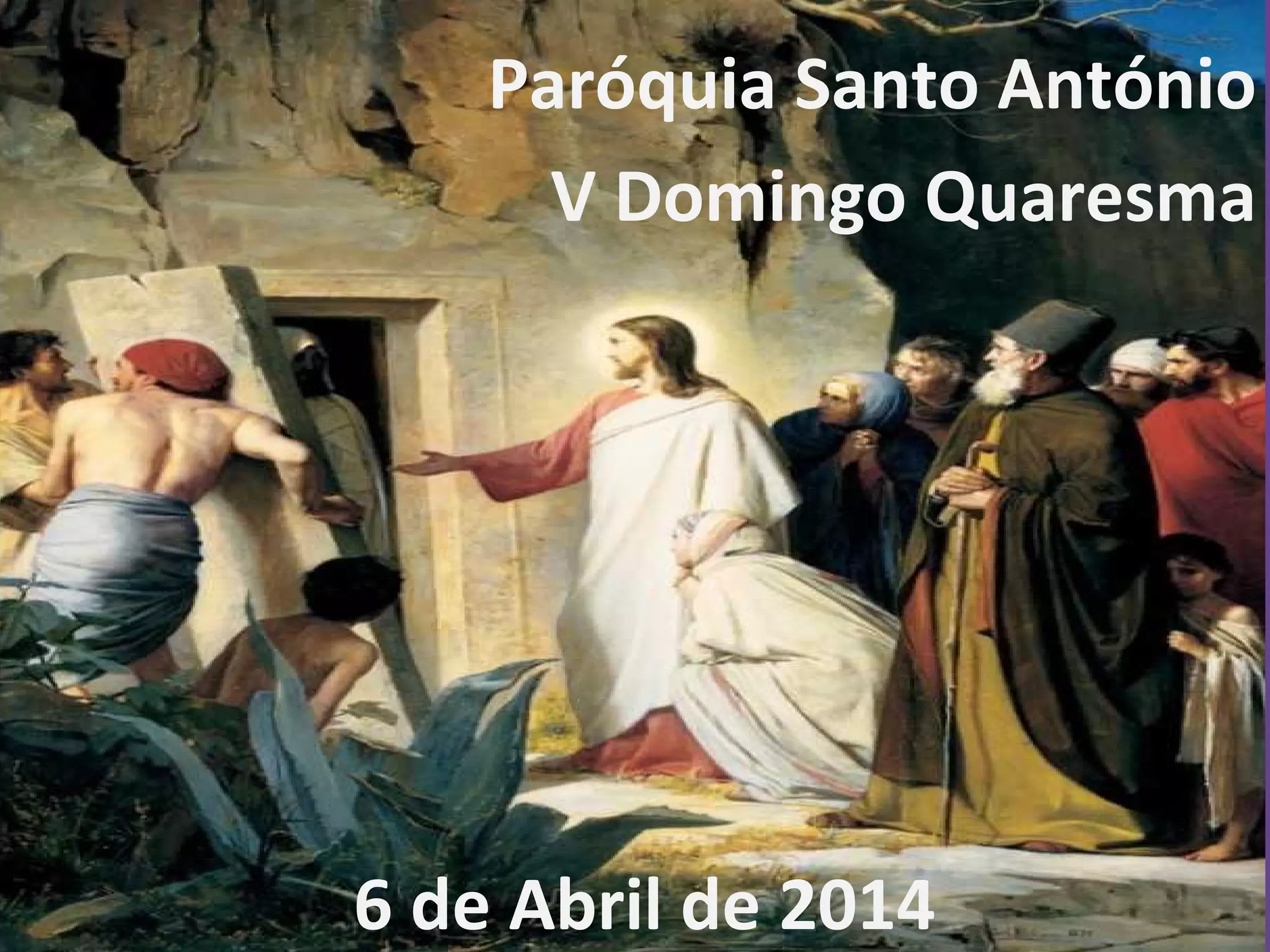 Este documento é o programa litúrgico para o V Domingo da Quaresma na Paróquia Santo António. Contém orações, hinos e leituras bíblicas para a missa, incluindo o Cântico de Ofertório, a Eucaristia, o Cântico de Comunhão e o Cântico de Ação de Graças.