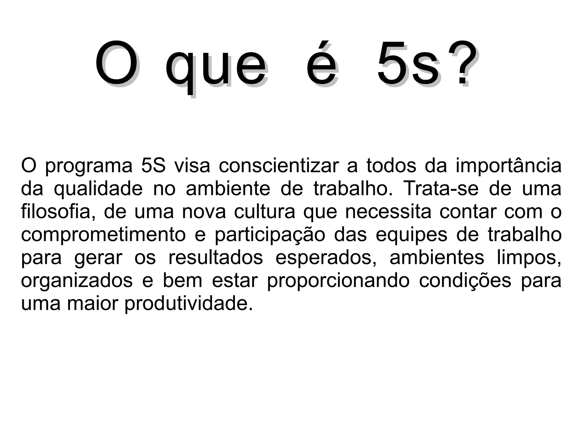 O programa 5S visa promover um ambiente de trabalho limpo, organizado e saudável através de cinco conceitos: seiri (separar o útil do inútil), seiton (identificar e arrumar tudo), seiso (manter um ambiente limpo), seiketsu (manter a higiene e saúde) e shitsuke (tornar essas atitudes um hábito). O 5S foi criado no Japão após a Segunda Guerra Mundial para auxiliar na reestruturação industrial do país e melhora a produtividade.