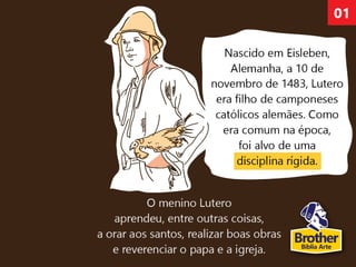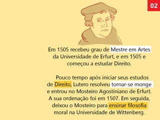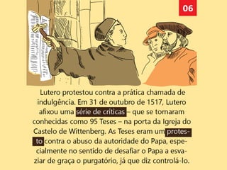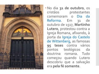 O documento descreve os principais pontos das 95 teses de Lutero, que protestavam contra a venda de indulgências pela Igreja Católica Romana. Também discute outros reformadores como Calvino e Zwinglio e os cinco pilares da Reforma Protestante ("Cinco Solas"). Finalmente, reflete sobre as lições da Reforma para a igreja moderna.