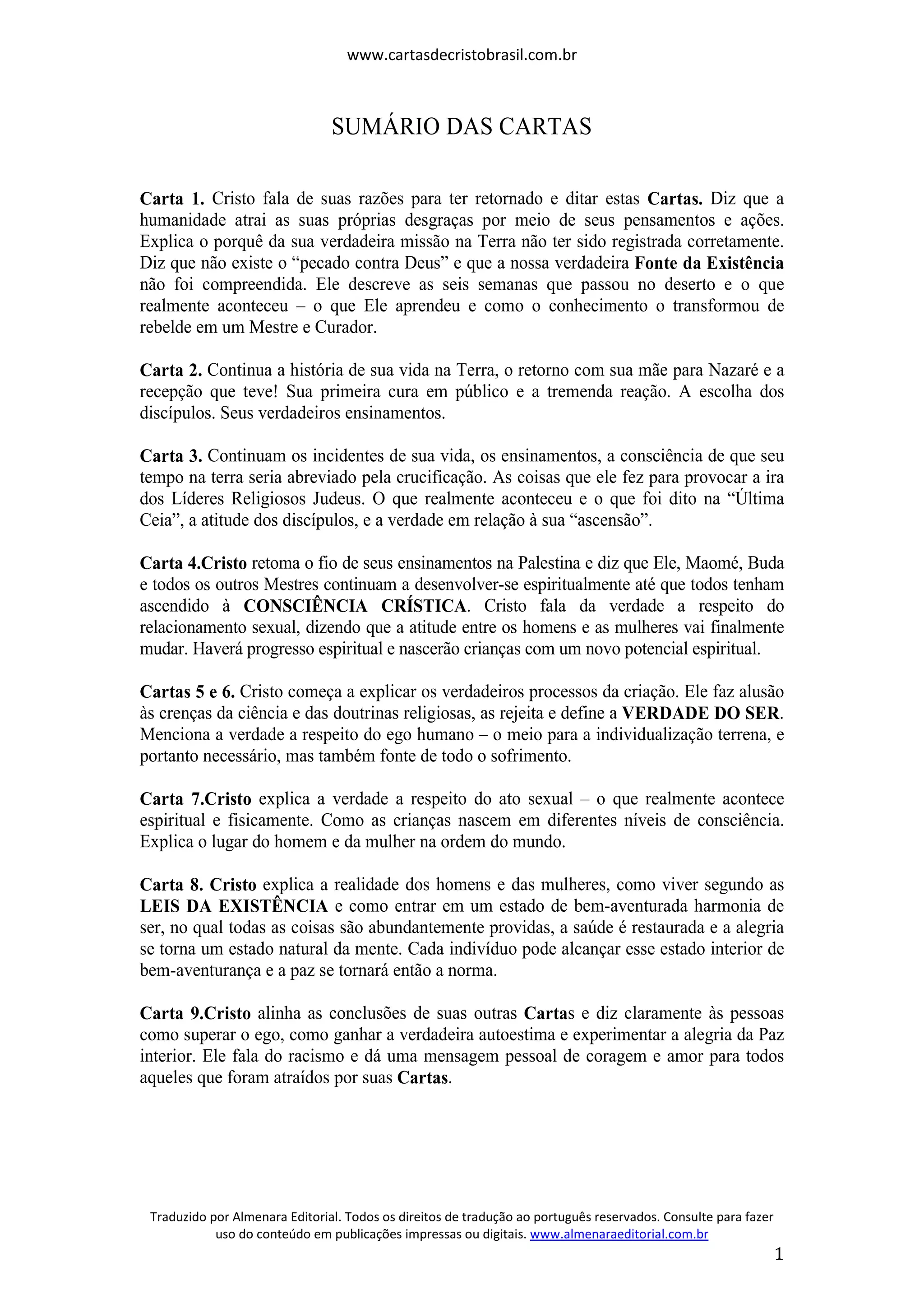 As cartas resumem os ensinamentos de Cristo sobre a verdadeira natureza da criação, do ego, e como alcançar a paz interior através do autoconhecimento e harmonia com as leis da existência. Ele explica que nascemos em diferentes níveis de consciência e que o relacionamento entre os sexos mudará conforme a humanidade progrida espiritualmente.