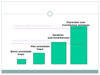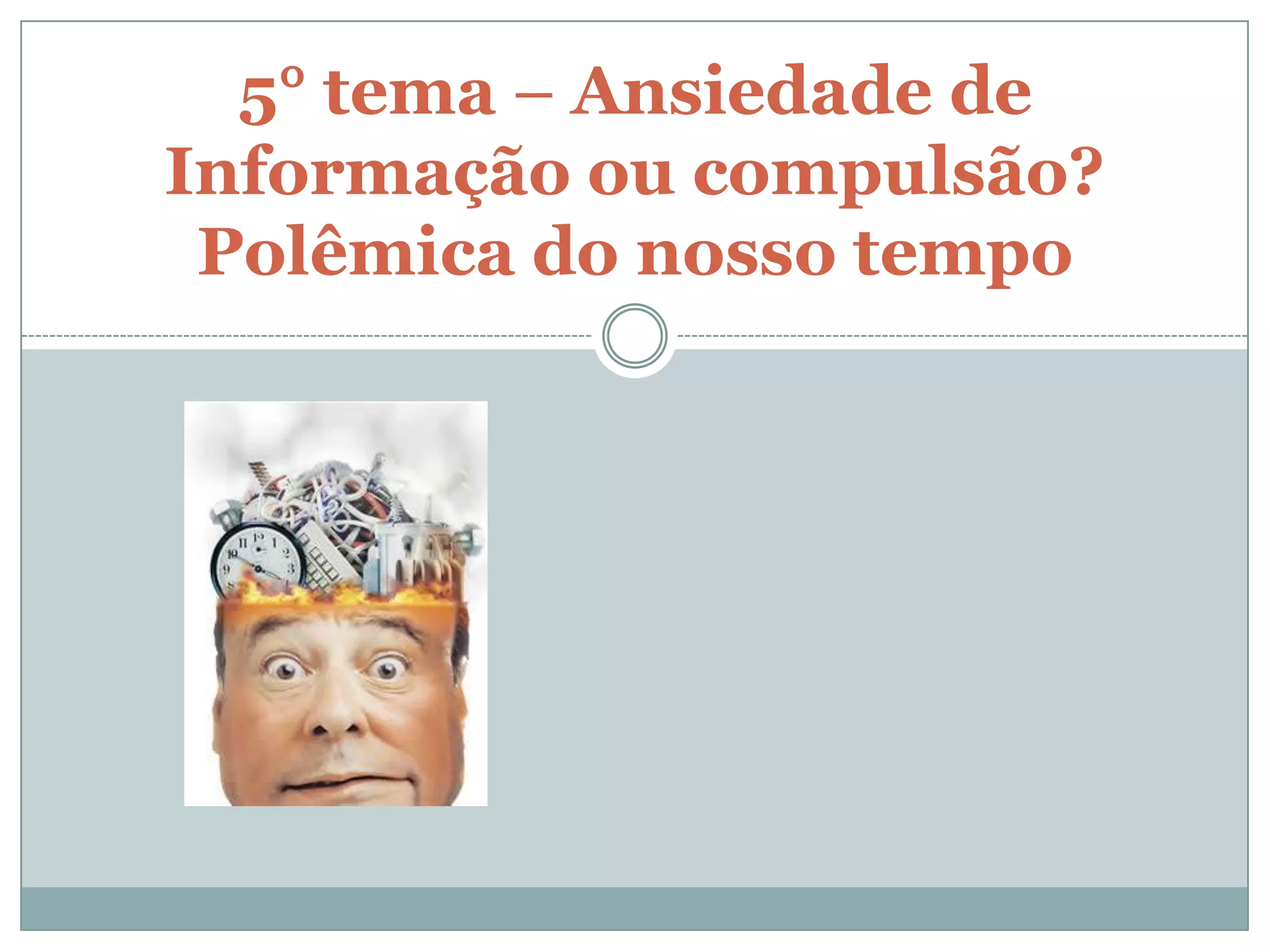 O documento discute ansiedade, compulsão e informação excessiva. Apresenta definições de ansiedade, suas causas e tipos de transtornos ansiosos. Também aborda obsessões, compulsões e a chamada "fadiga de informação", onde excesso de dados pode causar problemas psicológicos. Por fim, discute o possível transtorno de adição à internet.