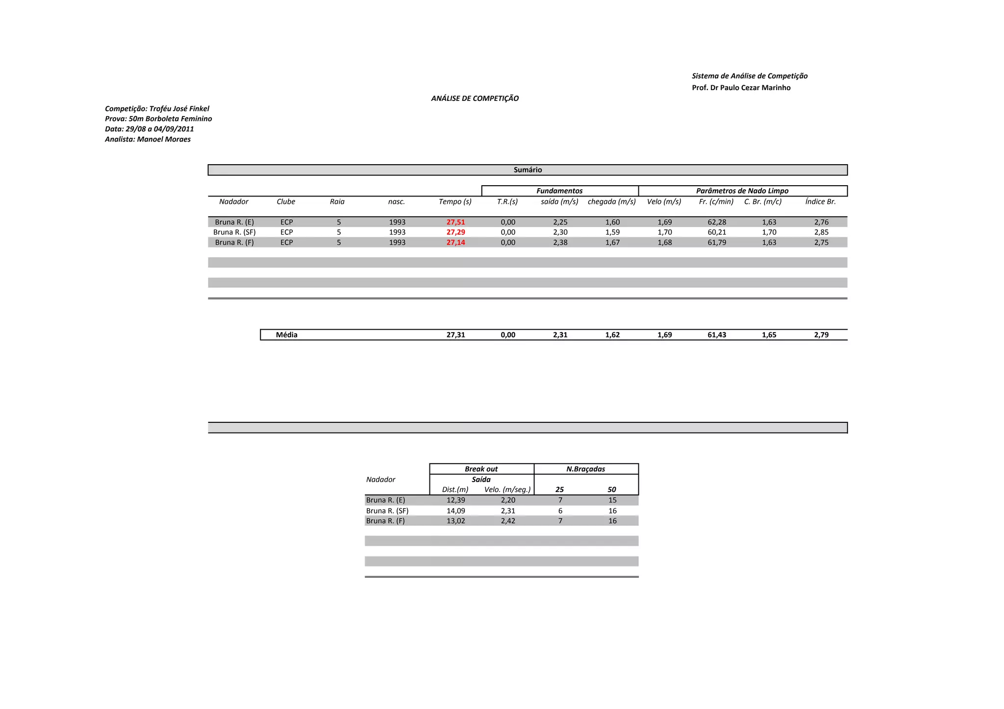 O documento analisa o desempenho da nadadora Bruna R. nos 50m borboleta no campeonato Troféu José Finkel. Fornece detalhes sobre sua velocidade, comprimento de braçadas e frequência cardíaca em diferentes trechos da prova, comparando seus resultados nas eliminatórias, semifinais e final.