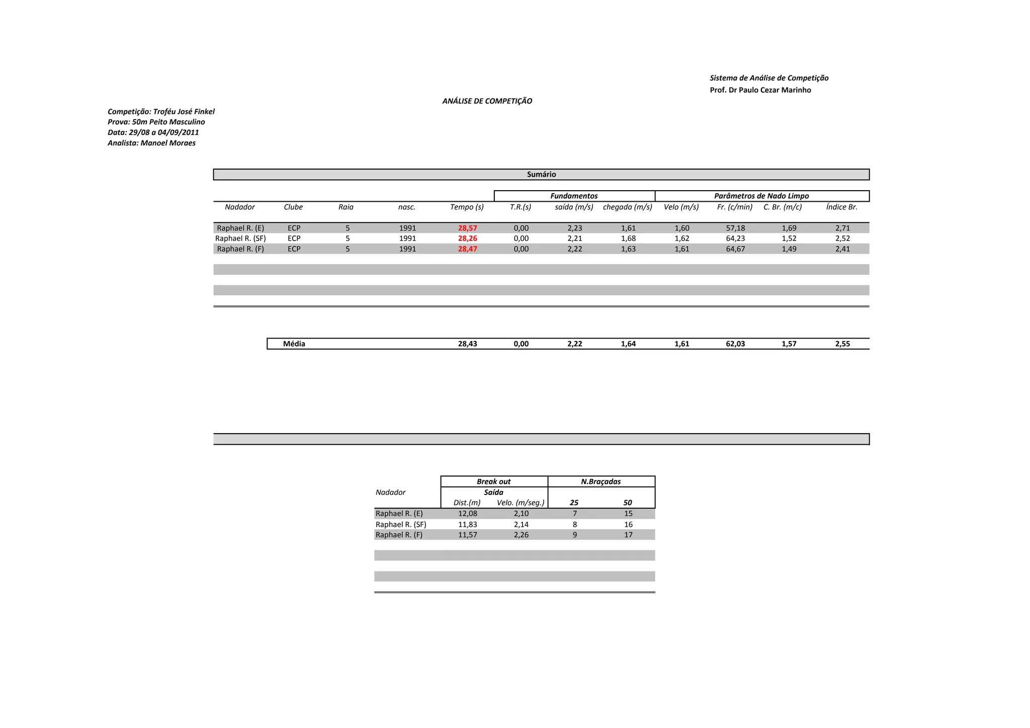 O documento analisa o desempenho do nadador Raphael R. nos 50m peito no Troféu José Finkel em 2011, fornecendo dados como tempo, velocidade média, frequência e comprimento de braçadas em diferentes trechos da prova.