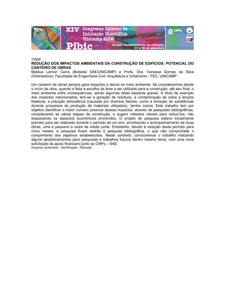 Este documento discute a redução dos impactos ambientais causados pela construção de edifícios. Ele identifica vários impactos como geração de resíduos e poluição durante as diferentes etapas de construção. O objetivo é sugerir métodos para reduzir esses impactos de forma econômica através de pesquisa bibliográfica. Devido a limitações de tempo, o estudo será restrito à pesquisa em vez de acompanhar obras como planejado originalmente.