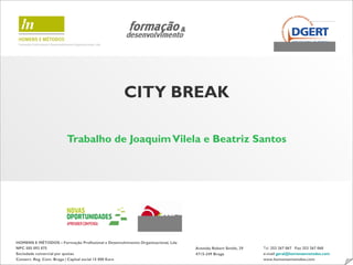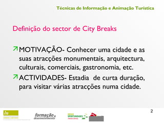 O documento define city breaks como estadias de curta duração em cidades para visitar atrações. Apresenta três perfis de turistas city breaks: standard, que buscam opções mais econômicas; upscale, que desejam luxo; e temáticos, focados em eventos. Lisboa e Porto são apontadas como principais destinos portugueses para city breaks.