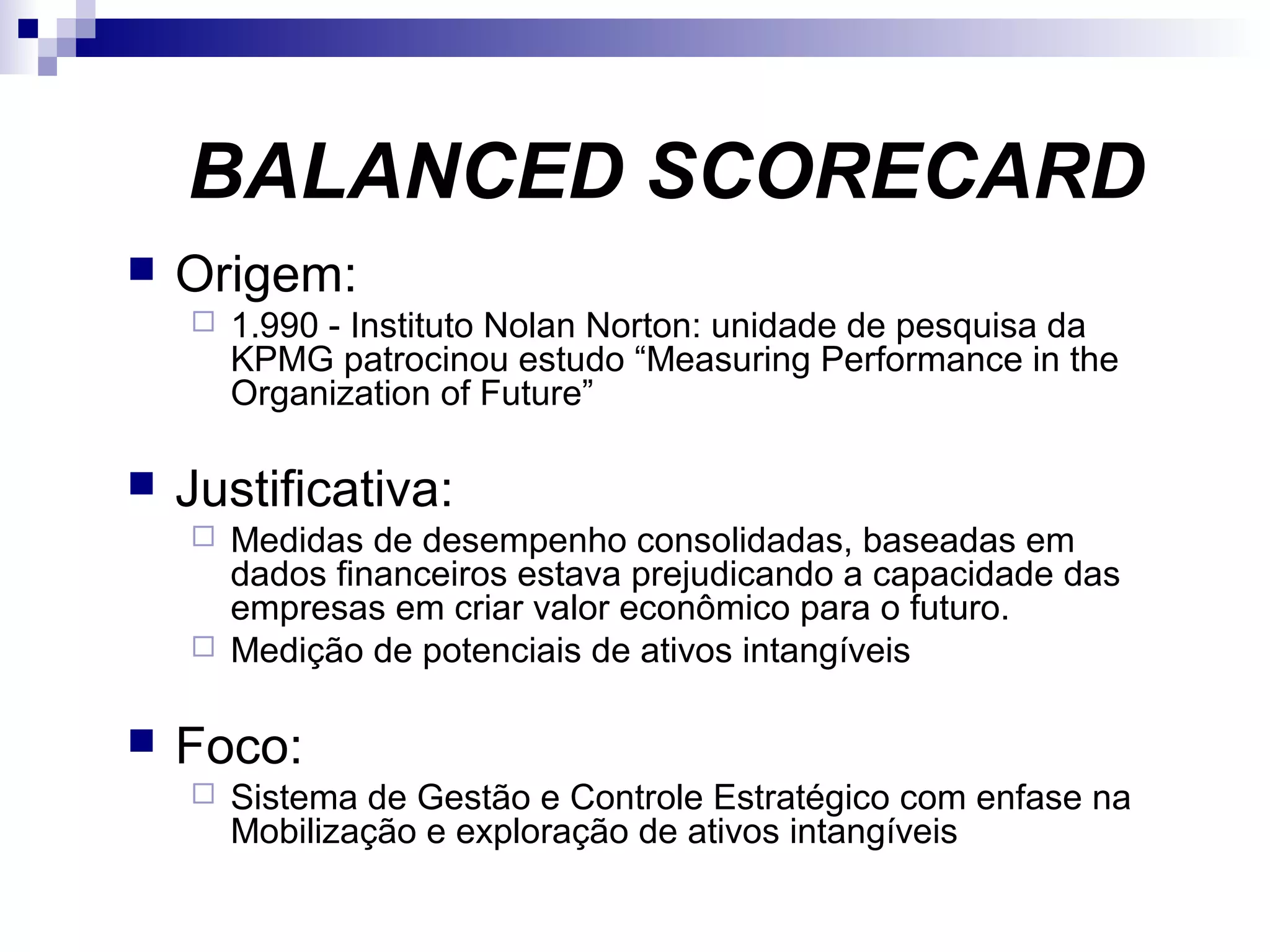O documento descreve o Balanced Scorecard, originado em 1990 para medir o desempenho das empresas com foco nos ativos intangíveis. Ele propõe acompanhar o desempenho por quatro perspectivas: financeira, clientes, processos internos e aprendizado/crescimento. O objetivo é equilibrar medidas financeiras e não financeiras para gerar valor futuro.