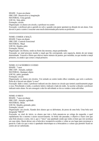 Este documento fornece instruções para 53 brincadeiras e dinâmicas infantis, incluindo objetivos, materiais necessários, formação e execução de cada atividade. As brincadeiras envolvem desenvolvimento de habilidades como audição, atenção, coordenação motora e imaginação, e são destinadas a crianças de 6 a 10 anos de idade.