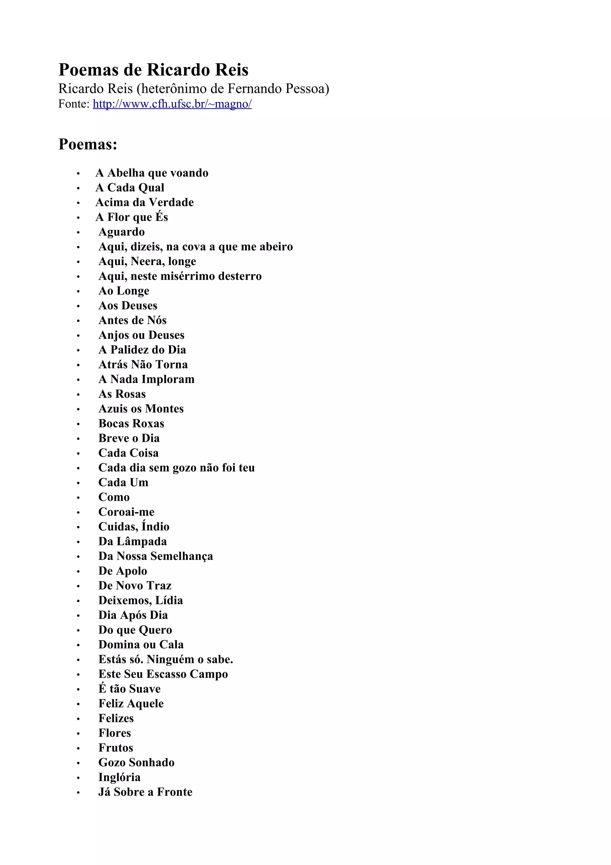 Este documento lista e descreve brevemente os poemas do poeta Ricardo Reis, que era na verdade um heterônimo de Fernando Pessoa. A lista inclui os títulos de mais de 40 poemas de Ricardo Reis.