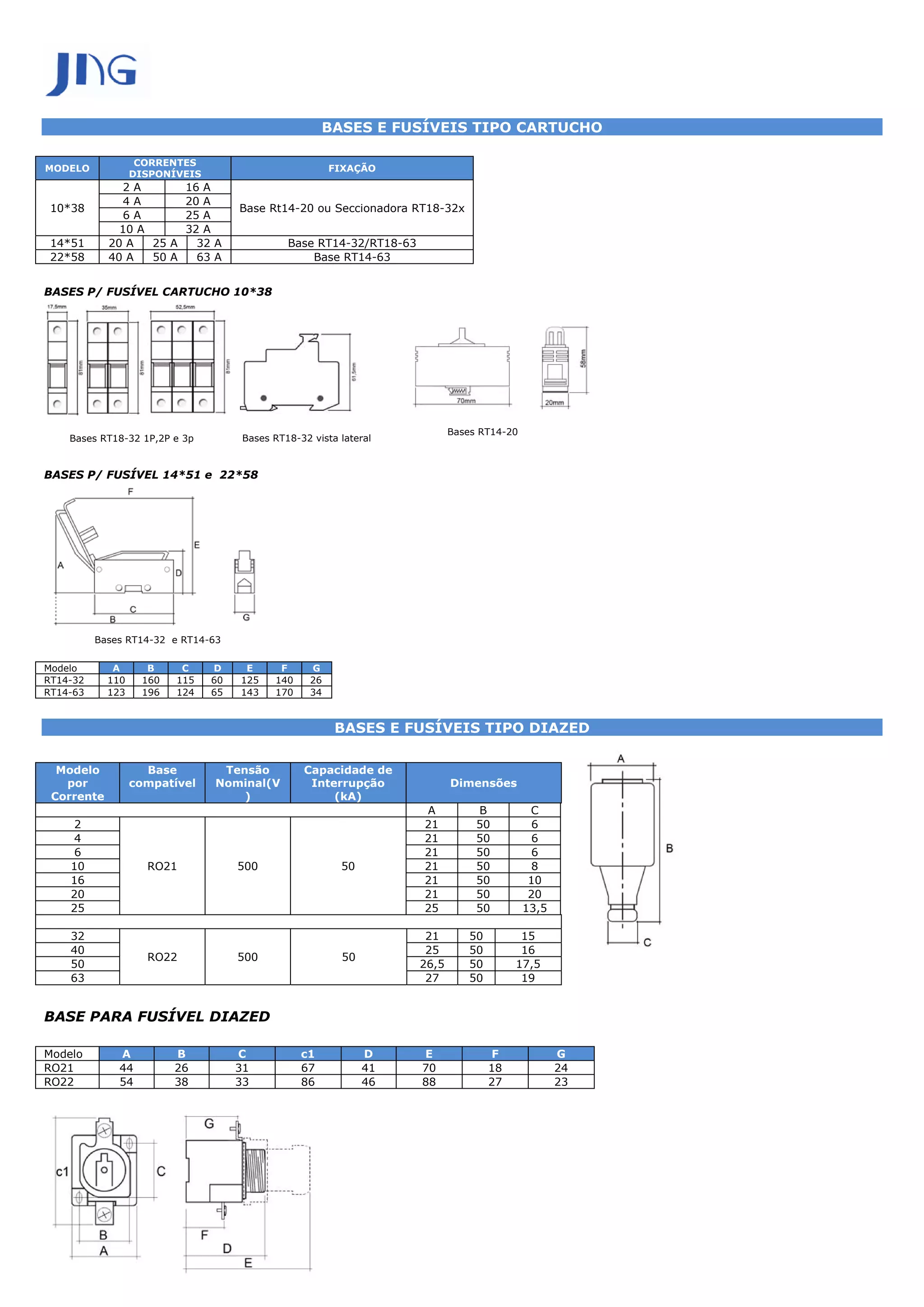 Este documento apresenta modelos de bases e fusíveis para diferentes aplicações elétricas, incluindo suas dimensões e especificações técnicas. São listados modelos de bases compatíveis com fusíveis dos tipos cartucho, diazado e NH, com indicação das correntes nominais suportadas, tensões e capacidades de interrupção de cada um. As ilustrações mostram exemplos de bases para cada tipo de fusível.