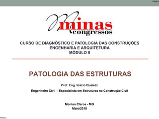 O documento apresenta um curso sobre diagnóstico e patologia de construções. Apresenta o professor, os objetivos do curso que são compreender as investigações e identificar patologias em estruturas. Também aborda conceitos como desempenho, durabilidade, manutenção, causas de problemas, inspeção, identificação de danos e intervenções para reparos.