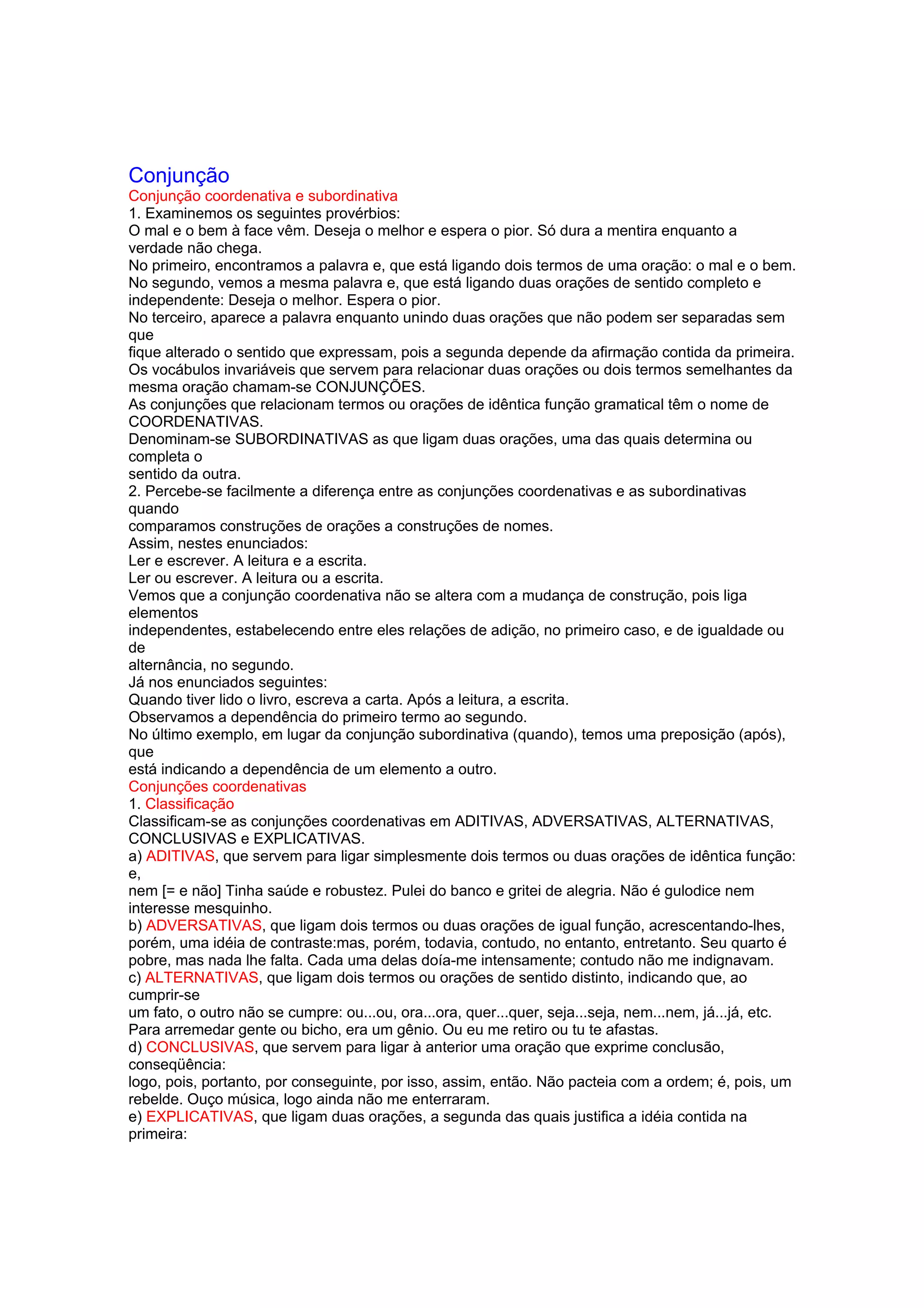 1) O documento discute as conjunções coordenativas e subordinativas, classificando-as em vários tipos e explicando suas funções gramaticais. 2) As conjunções coordenativas ligam termos ou orações independentes, enquanto as subordinativas ligam orações dependentes umas das outras. 3) Exemplos ilustram o uso e posição das diferentes conjunções.