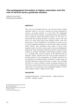 O documento discute a formação pedagógica de professores no ensino superior brasileiro e o papel da pós-graduação stricto sensu nesse processo. Ele argumenta que a pós-graduação atualmente se concentra principalmente na formação científica e na acumulação de capital científico, sem dar atenção adequada à dimensão pedagógica da docência.