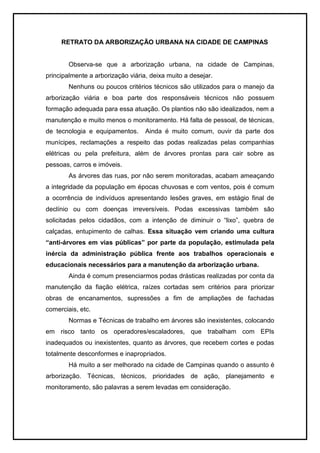 O documento discute o estado da arborização urbana na cidade de Campinas, apontando problemas como falta de planejamento, pessoal e técnicas adequadas, colocando em risco a população e as árvores. A Sociedade Brasileira de Arborização Urbana oferece soluções como treinamento de técnicos e normatização das empresas.
