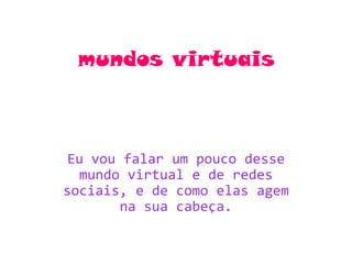 O documento discute vários tópicos sobre mundos virtuais e redes sociais, incluindo o Twitter, onde as pessoas se conhecem e seguem famosos, o MSN para conversar com amigos e familiares, e o jogo Counter-Strike, cujo objetivo é matar adversários com armas e bombas.