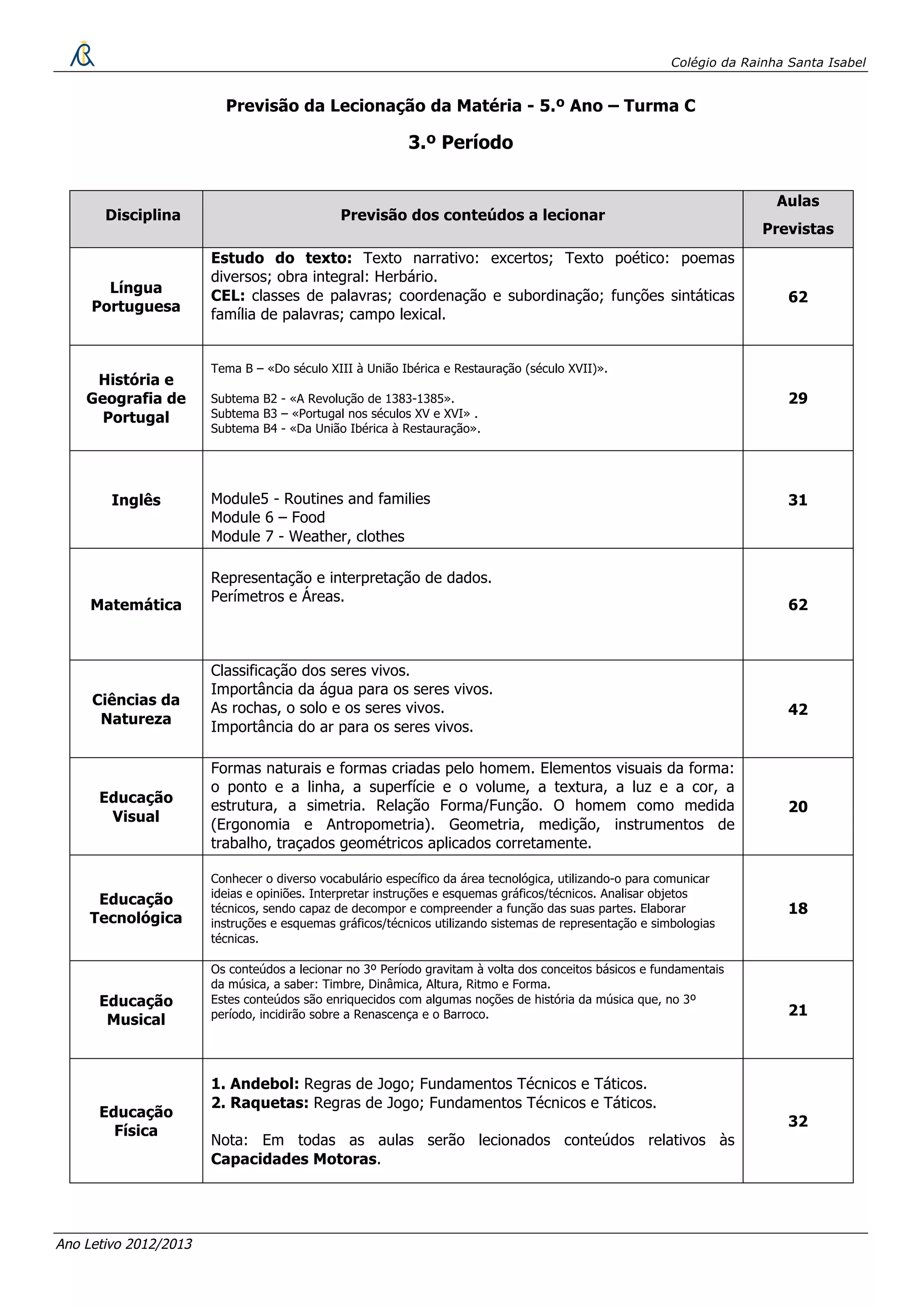 O documento apresenta o plano de aulas para o 3o período letivo de 2012/2013 para a turma C do 5o ano do Colégio da Rainha Santa Isabel. Detalha as disciplinas lecionadas, os conteúdos programáticos e o número de aulas previstas para cada matéria, incluindo Língua Portuguesa, História e Geografia de Portugal, Inglês, Matemática, Ciências da Natureza, Educação Visual, Educação Tecnológica, Educação Musical, Educação Física, Raízes Greco
