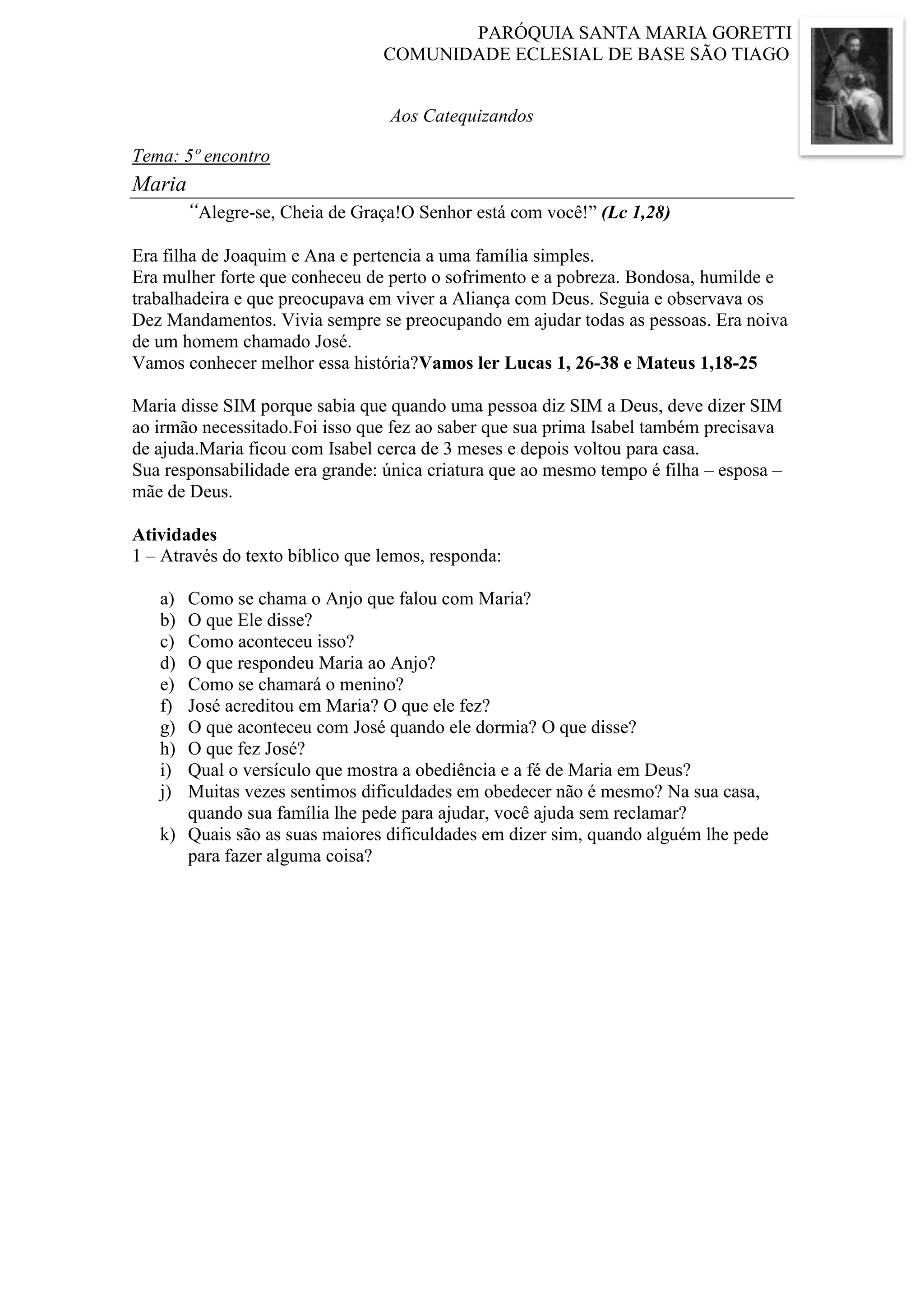 Maria era uma jovem humilde e obediente a Deus. O anjo Gabriel apareceu para ela e disse que ela conceberia e daria à luz um filho chamado Jesus. Maria respondeu "faça-se em mim segundo a tua palavra". Ela acreditou no plano de Deus apesar das dificuldades.