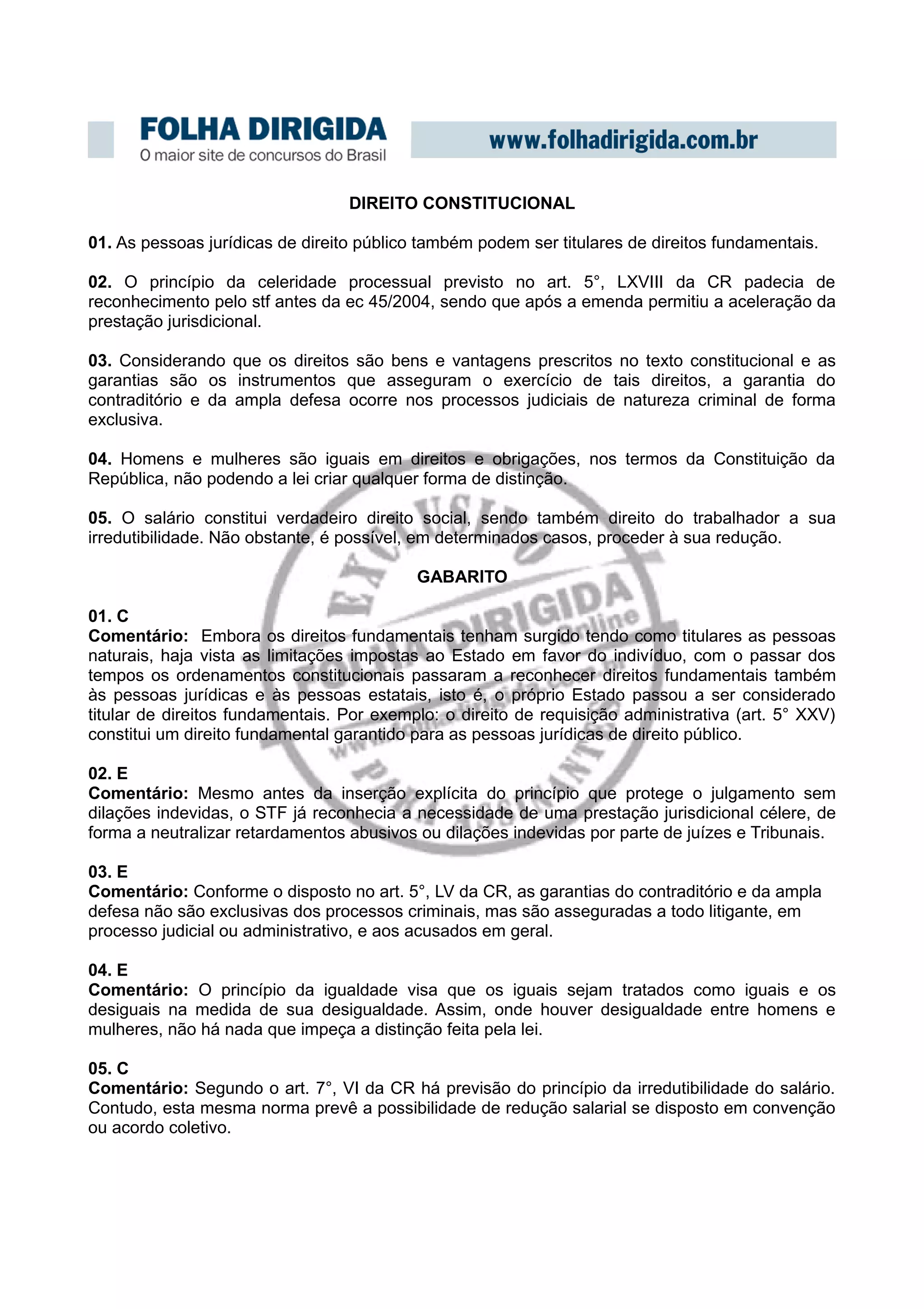 O documento discute alguns princípios do direito constitucional brasileiro, como: 1) pessoas jurídicas públicas podem ser titulares de direitos fundamentais; 2) o princípio da celeridade processual foi reconhecido pelo STF após a EC 45/2004; 3) as garantias do contraditório e ampla defesa não são exclusivas de processos criminais.