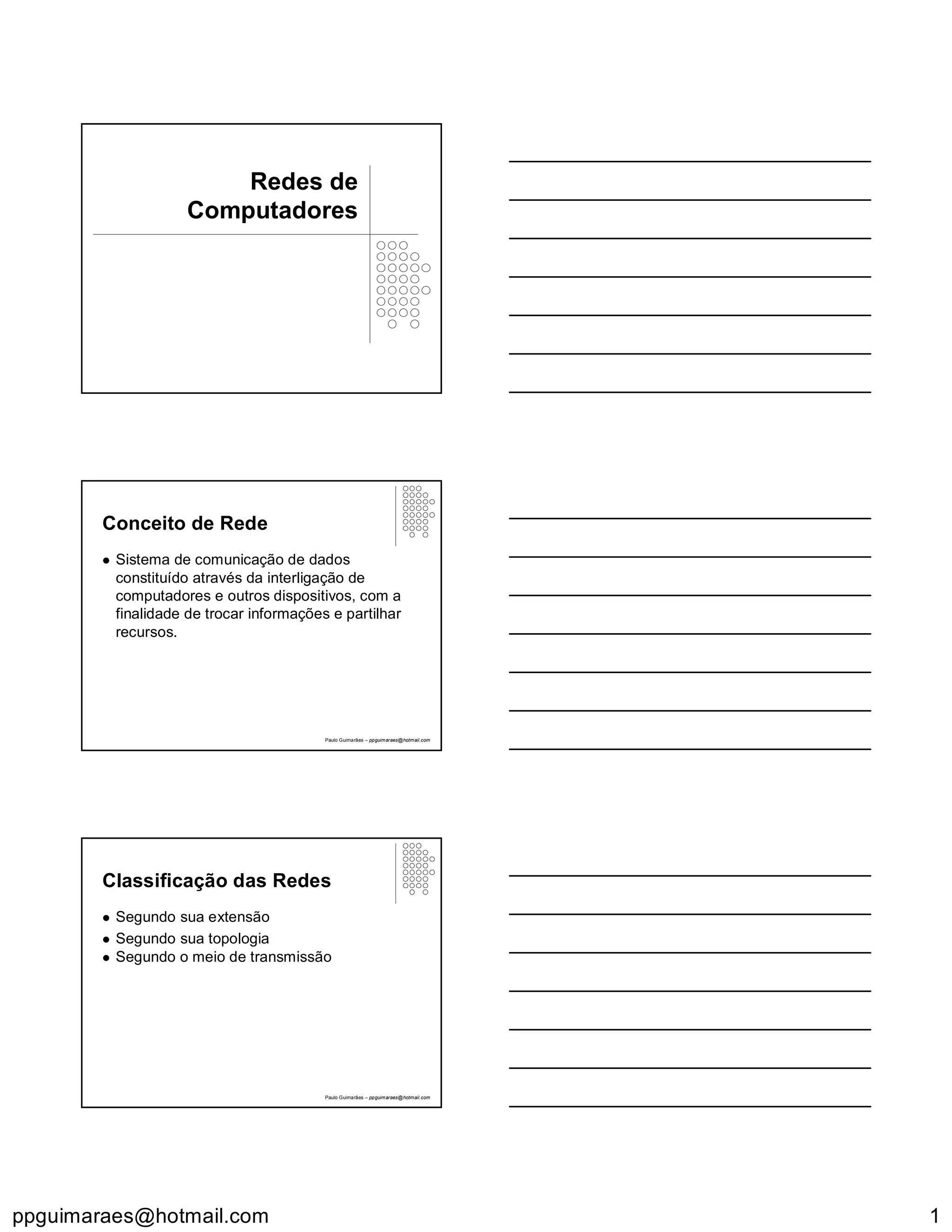 O documento discute conceitos básicos de redes de computadores, incluindo classificação de redes segundo extensão, topologia e meio de transmissão. Também aborda dispositivos de rede, protocolos de comunicação e sistemas operacionais para redes.