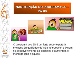 O documento discute o programa 5S, que consiste em cinco princípios (seiri, seiton, seiso, seiketsu, shitsuke) para manter a organização e limpeza no ambiente de trabalho. O programa promove a disciplina, aumenta a produtividade e melhora a qualidade de vida no trabalho. É importante realizar periodicamente um "dia da bermuda" para descarte de itens desnecessários e limpeza aprofundada.