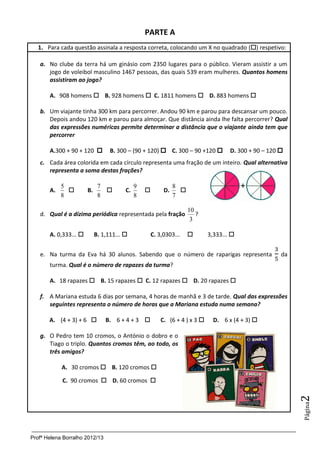 Este documento contém uma prova de matemática para alunos do 5o ano. A prova inclui questões de escolha múltipla, cálculos, frações, e expressões numéricas. As instruções pedem aos alunos para preencher os seus nomes e responder a todas as perguntas com atenção, mostrando os cálculos quando necessário.