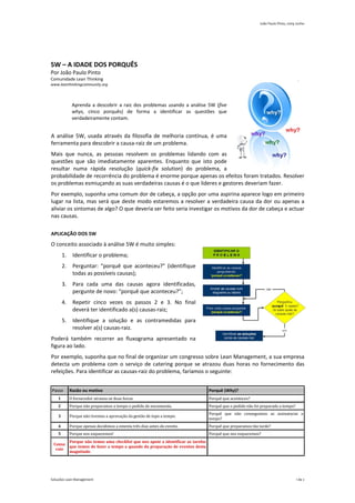 O documento descreve a técnica de análise 5W para identificar as causas-raiz de problemas. A técnica envolve perguntar "por quê?" 5 vezes para cada possível causa para chegar às razões fundamentais. Um exemplo mostra como a falta de uma checklist causou atrasos no fornecimento de refeições para um evento. A análise 5W é subjetiva e trabalhar em equipe pode ajudar a identificar melhor as causas-raiz.