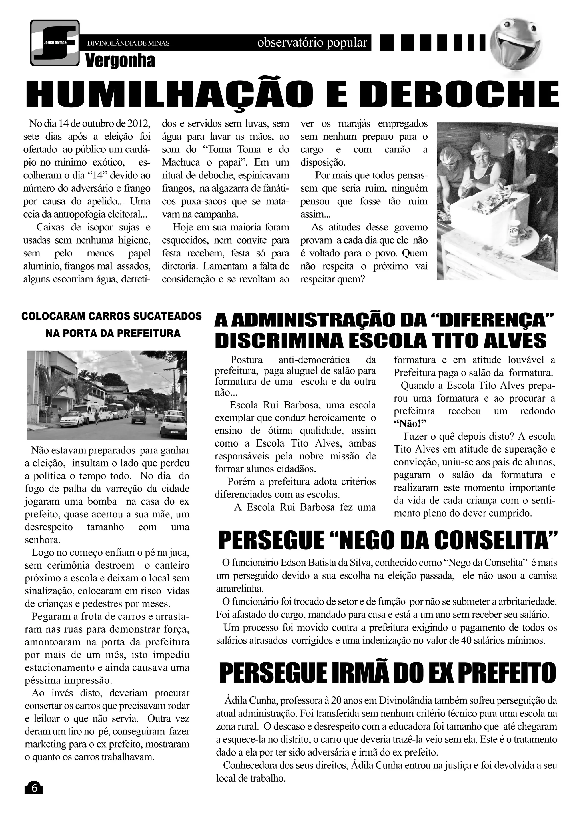[1] Um jantar político no dia 14 de outubro de 2012 ofereceu frangos mal assados e sujos sem higiene para humilhar o adversário político derrotado. [2] A atual administração colocou carros sucateados na porta da prefeitura por mais de um mês, atrapalhando o trânsito, e não consertou a frota como deveria. [3] A prefeitura pagou o aluguel de formatura de uma escola, mas se recusou a pagar para outra, discriminando alunos.