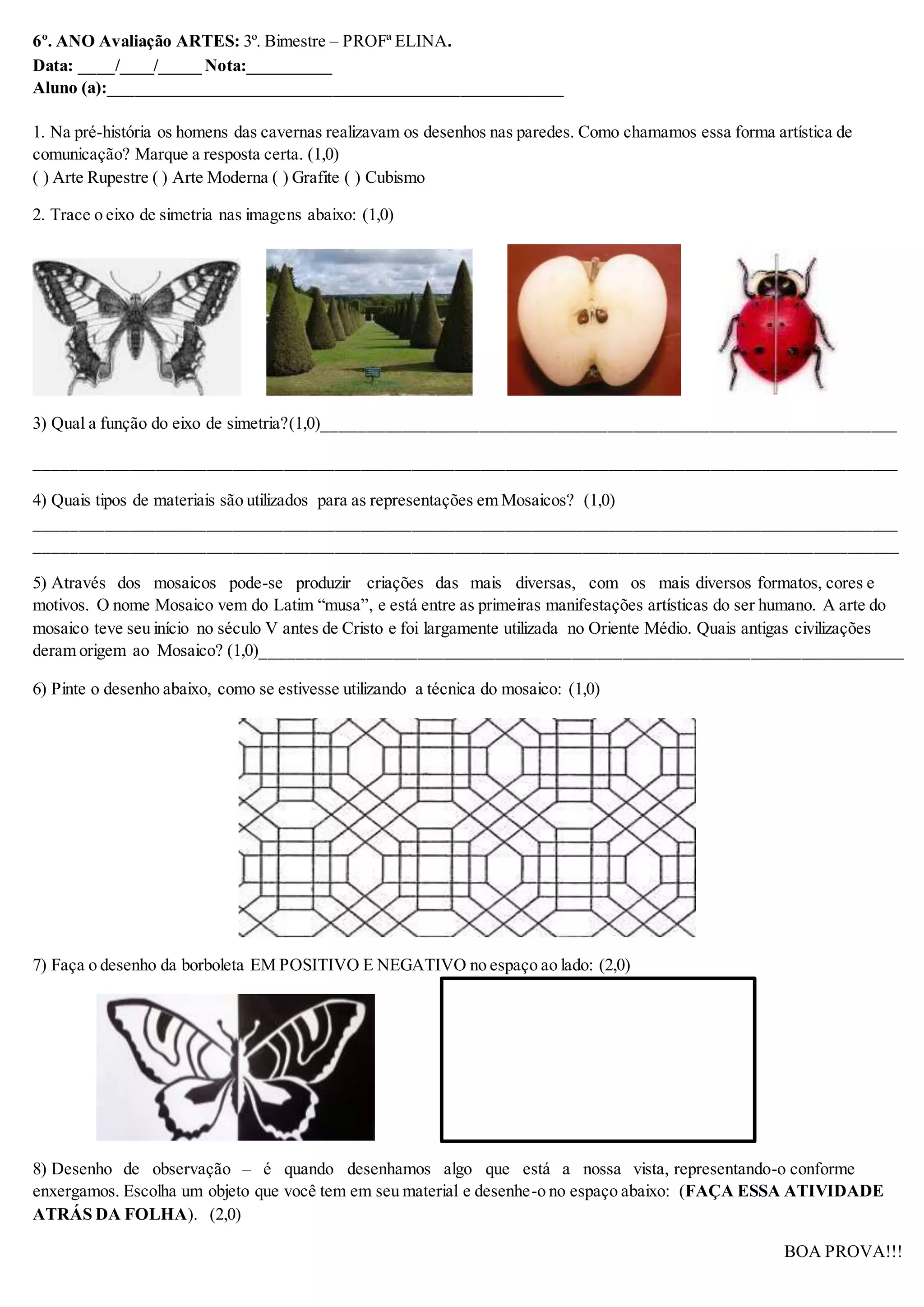 Este documento é uma avaliação de artes do 6o ano com 8 questões sobre arte rupestre, simetria, mosaico e desenho. As questões abordam a identificação da arte rupestre na pré-história, traçar eixos de simetria em imagens, civilizações que deram origem ao mosaico e realizar desenhos em positivo e negativo.