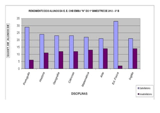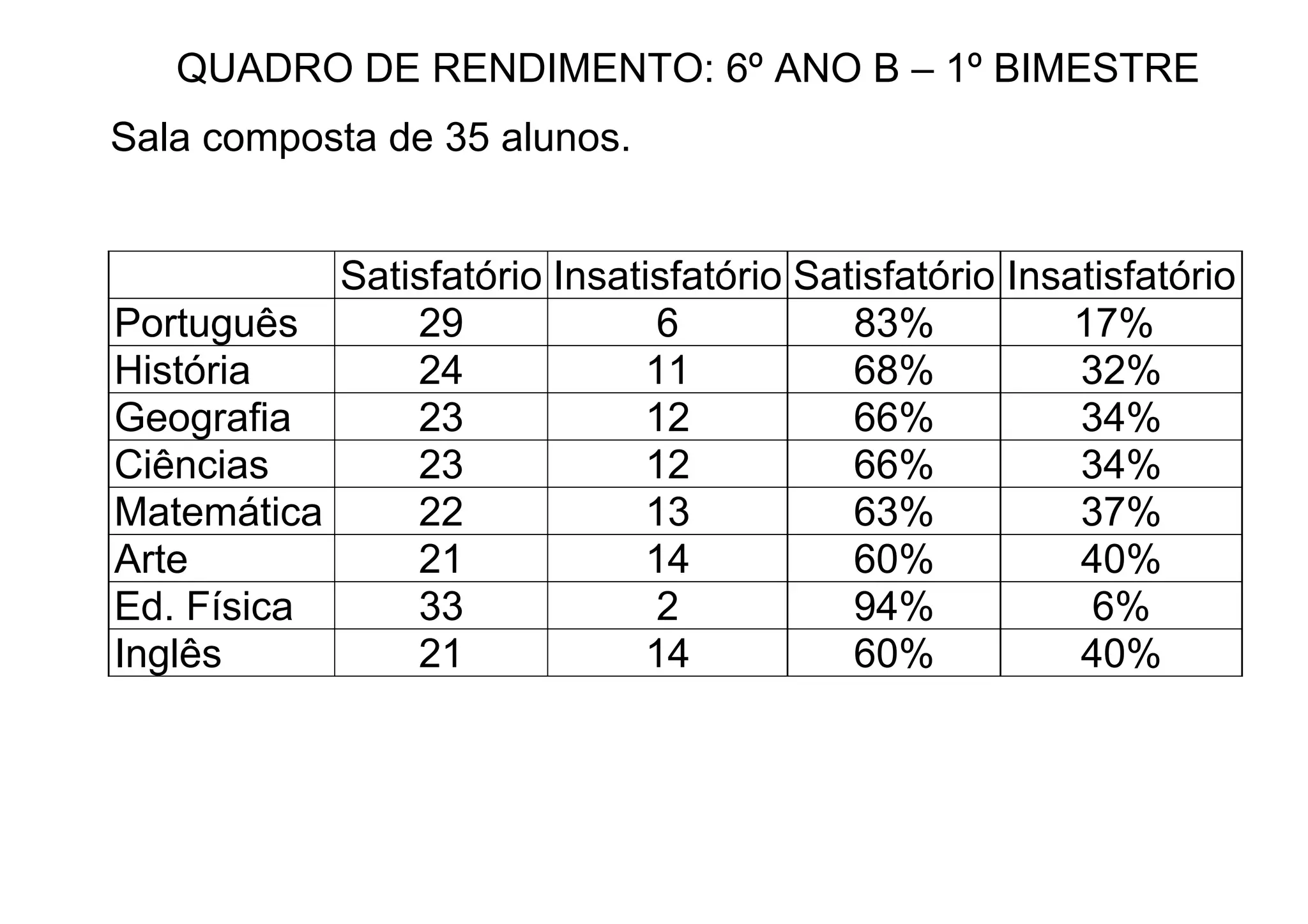 A sala de 6o ano B tinha 35 alunos no 1o bimestre. A maioria dos alunos teve desempenho satisfatório em Português, História, Geografia, Ciências e Inglês, com taxas de aprovação entre 60-83%. Já em Matemática e Arte, os alunos tiveram mais dificuldade, com taxas de aprovação de apenas 63% e 60% respectivamente.