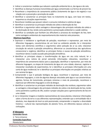 Este documento apresenta o plano de ensino de Ciências para o 6o ano do Ensino Fundamental durante o 2o semestre de 2015. O plano inclui os conteúdos a serem ensinados nos 3o e 4o bimestres, como poluição, saúde ambiental e características da Terra. As atividades propostas envolvem leituras, debates, experimentos e avaliações para desenvolver habilidades científicas e compreensão dos temas.