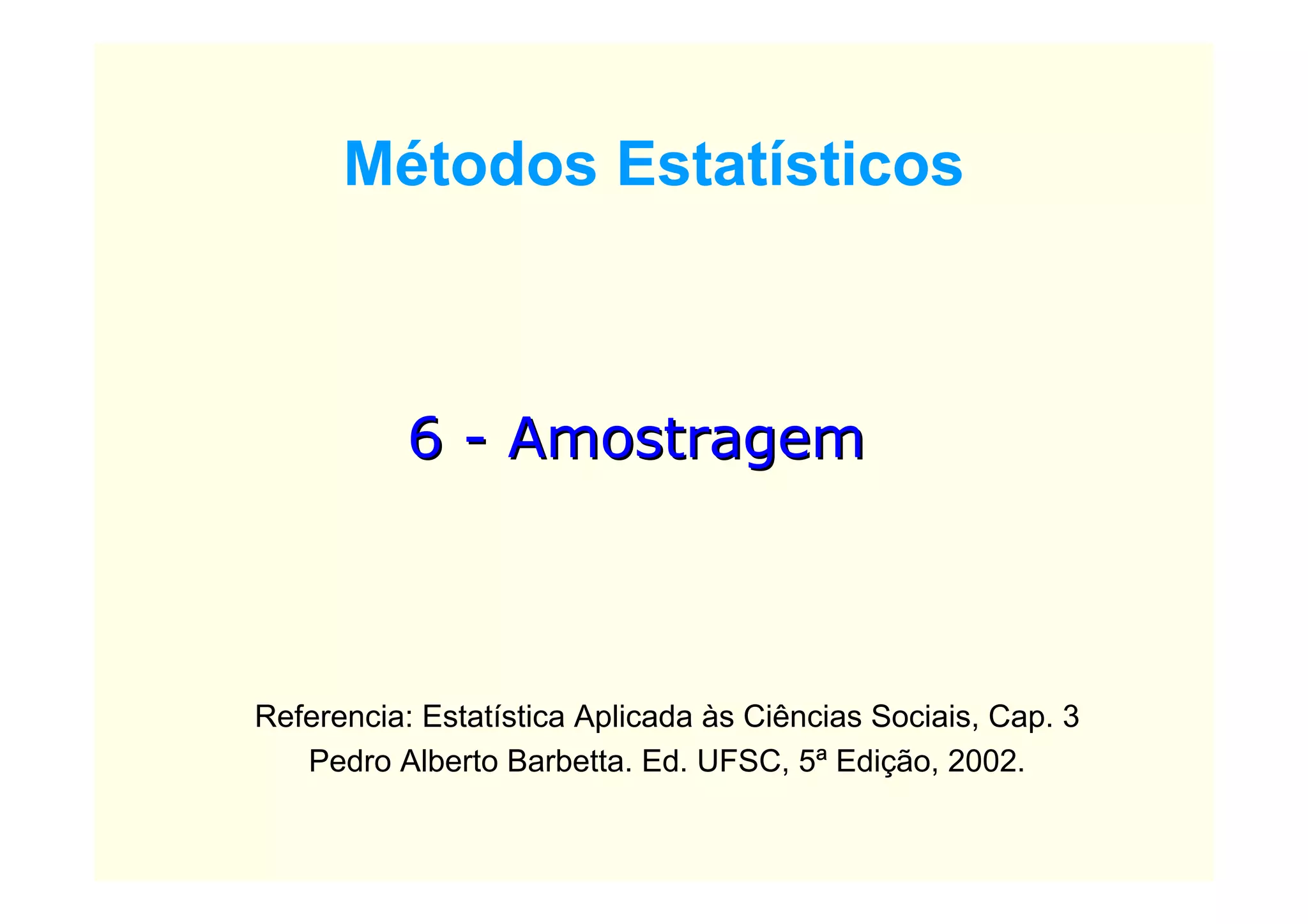 O documento descreve conceitos básicos de amostragem estatística, incluindo a diferença entre população e amostra, técnicas de amostragem probabilística e não probabilística, e fórmulas para calcular o tamanho adequado da amostra com base no tamanho da população e no erro amostral tolerável.