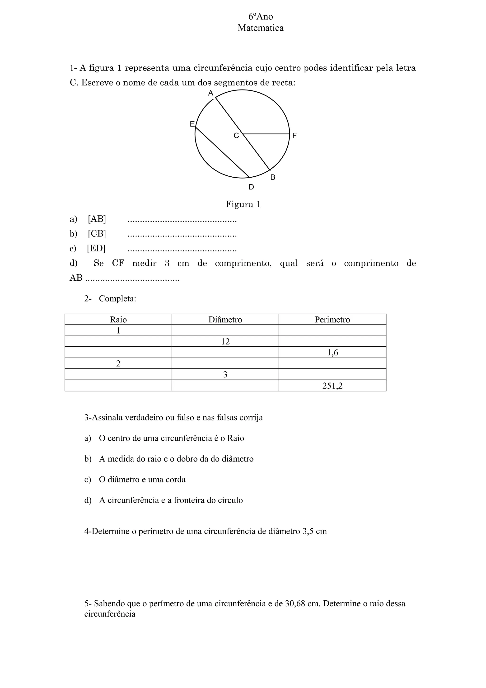 Este documento contém 16 exercícios de matemática sobre geometria plana e cálculos com figuras geométricas como circunferências, triângulos, quadriláteros e outros. Os exercícios abordam conceitos como raio, diâmetro, perímetro, ângulos, construção de figuras, propriedades dos quadriláteros e simetria.