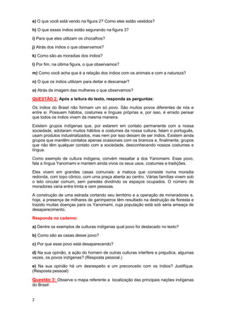 O documento discute a cultura indígena brasileira, destacando a importância de preservar suas tradições e a ameaça que povos como os Yanomami enfrentam devido à destruição de seu habitat pela construção de estradas e atividades de mineração.