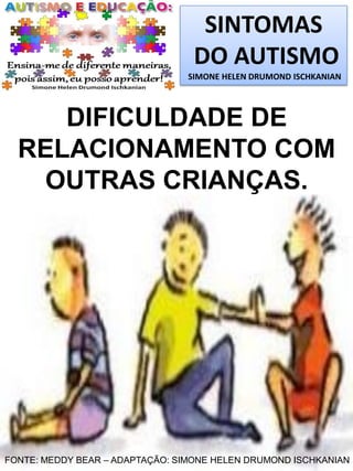O documento apresenta uma lista de sintomas relacionados ao autismo, conforme adaptado por Simone Helen Drumond Ischkanian. Entre os principais sintomas estão dificuldades de relacionamento, fala improdutiva, hipersensibilidade a sons e comportamentos repetitivos. Também são mencionados comportamentos sociais inadequados, como risadas e choros desproporcionais, além de fixação em objetos e falta de noção de perigo.