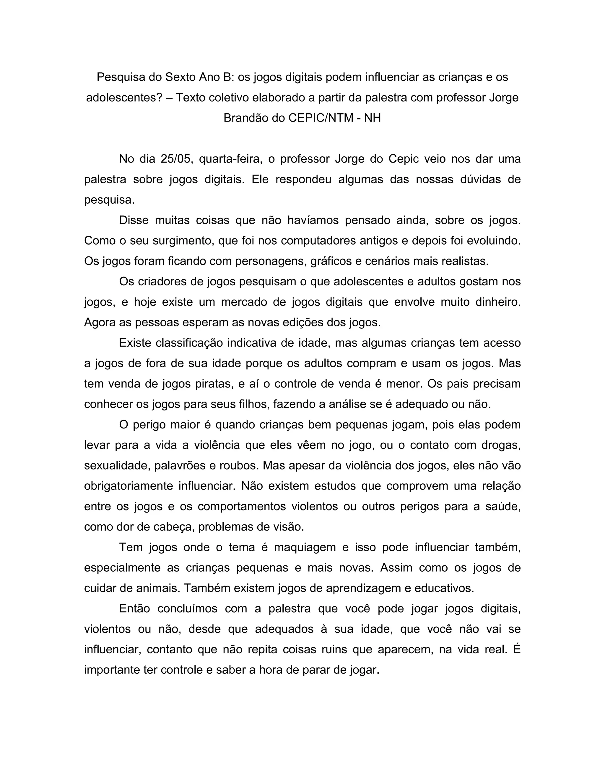 A palestra do professor Jorge Brandão discutiu a influência dos jogos digitais nas crianças e adolescentes, abordando sua evolução e o mercado crescente. Embora haja preocupações sobre a exposição a conteúdos violentos, ele destacou a falta de evidências que comprovem uma relação direta entre jogos e comportamentos agressivos. A conclusão enfatizou a importância da supervisão parental e do consumo responsável de jogos adequados à idade.