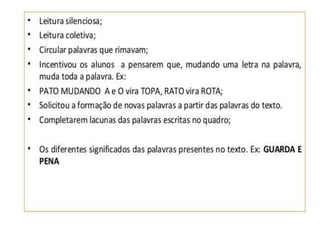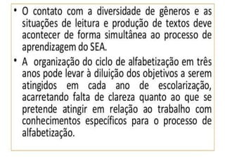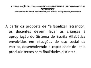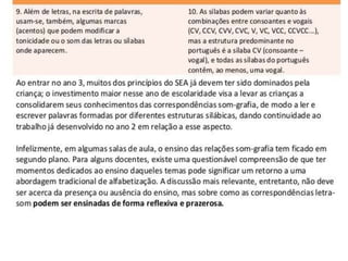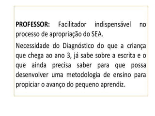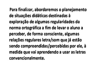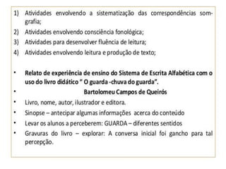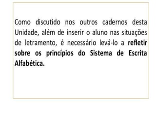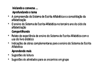 O documento descreve a pauta de um encontro de orientação de estudos. A pauta inclui entrega de livros, discussão sobre correspondência letra-som, vídeo sobre apropriação do sistema de escrita alfabética, leitura de um texto e tarefas de análise de atividades didáticas e leitura de outro texto para discussão.
