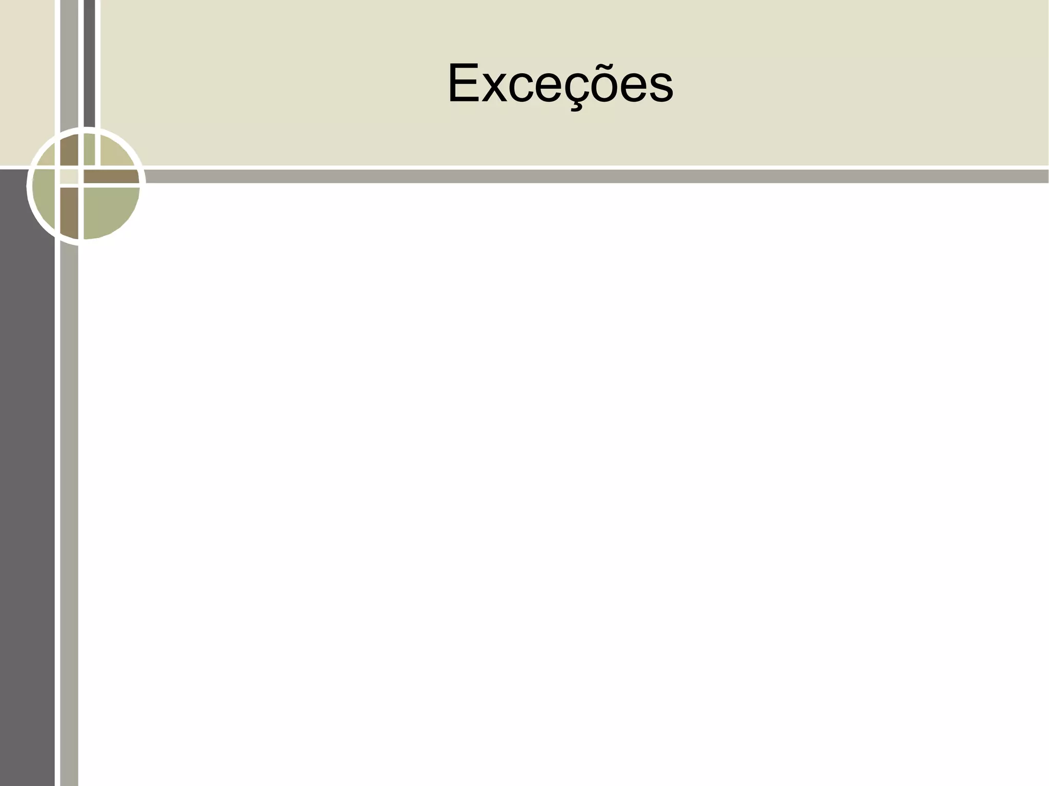 O documento discute exceções em Java, definindo-as como situações inesperadas no sistema e descrevendo formas de tratá-las, incluindo try/catch para capturar erros específicos e throws para delegar exceções de métodos. O documento também diferencia entre exceções não verificadas, como NullPointerException, e exceções verificadas que devem ser tratadas.