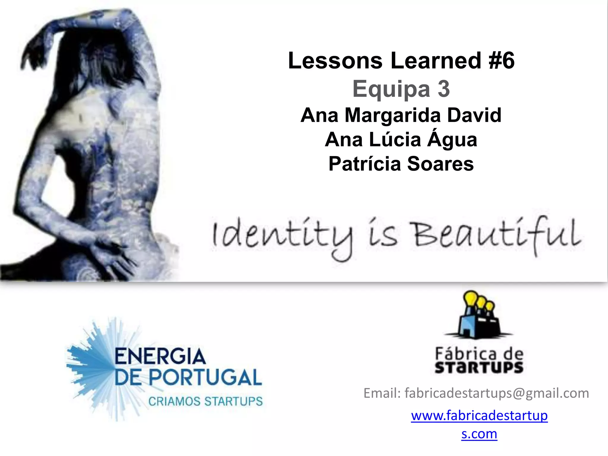 Este documento resume as atividades da Equipa 3 no Bootcamp do Energia de Portugal. A equipa está a desenvolver uma marca de acessórios de moda premium que reflete identidade cultural e hereditária. Realizaram entrevistas, testaram hipóteses, definiraram componentes chave e tarefas. A próxima etapa é concluir protótipos e validar parcerias.