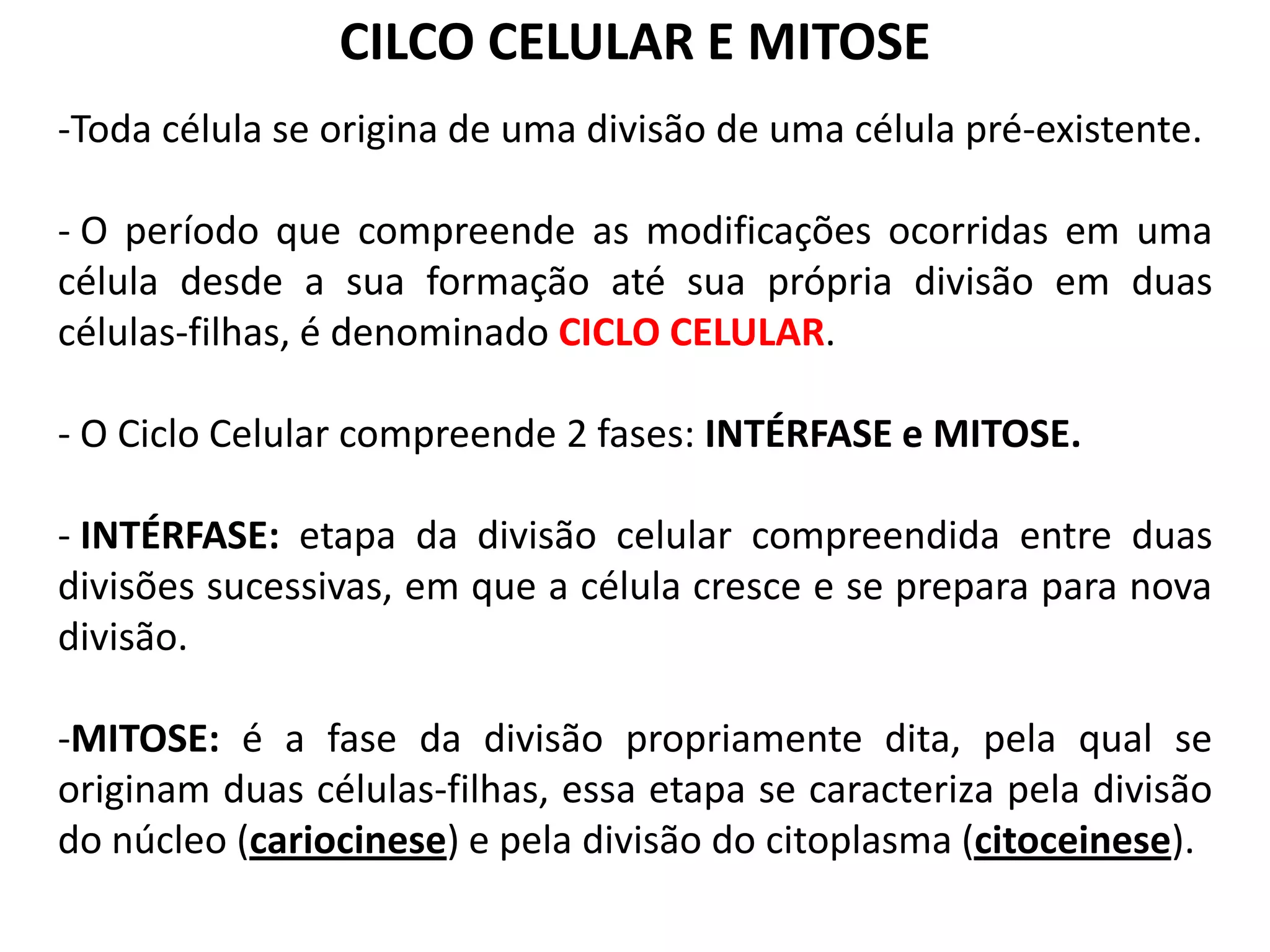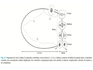 O documento descreve as etapas do ciclo celular e da mitose. O ciclo celular inclui a interfase, onde a célula cresce e se prepara para a divisão, e a mitose, onde ocorre a divisão do material genético. A interfase inclui as fases G1, S e G2, e a mitose inclui as fases de prófase, metáfase, anáfase e telófase.