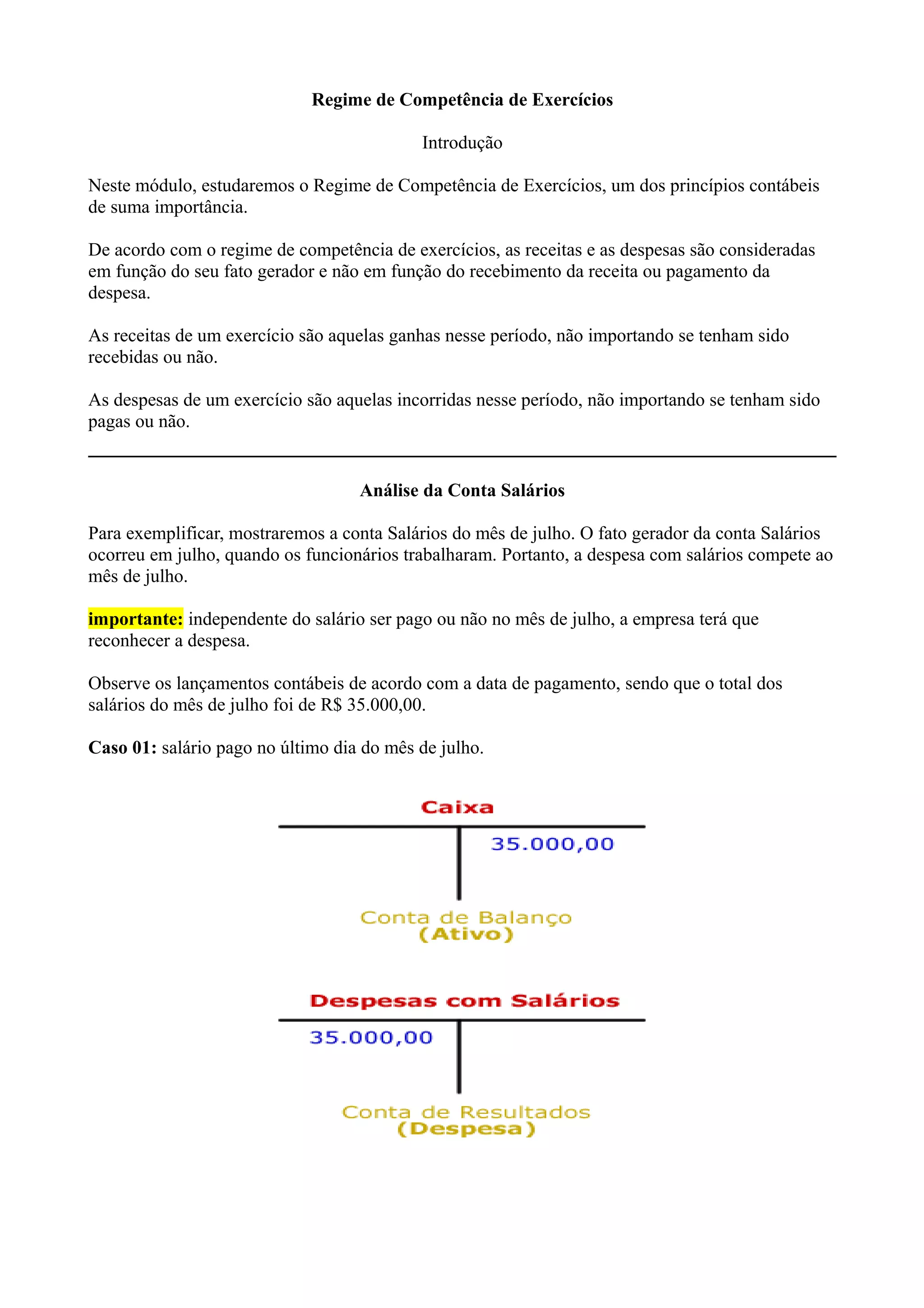 O documento discute o regime de competência de exercícios, no qual as receitas e despesas são reconhecidas no período em que ocorreram o fato gerador, não importando se foram recebidas ou pagas. Exemplifica com a conta salários, mostrando como reconhecer a despesa no mês de competência mesmo que o pagamento ocorra em outro mês. Também aborda receitas e despesas antecipadas que podem ser apropriadas para outros períodos.