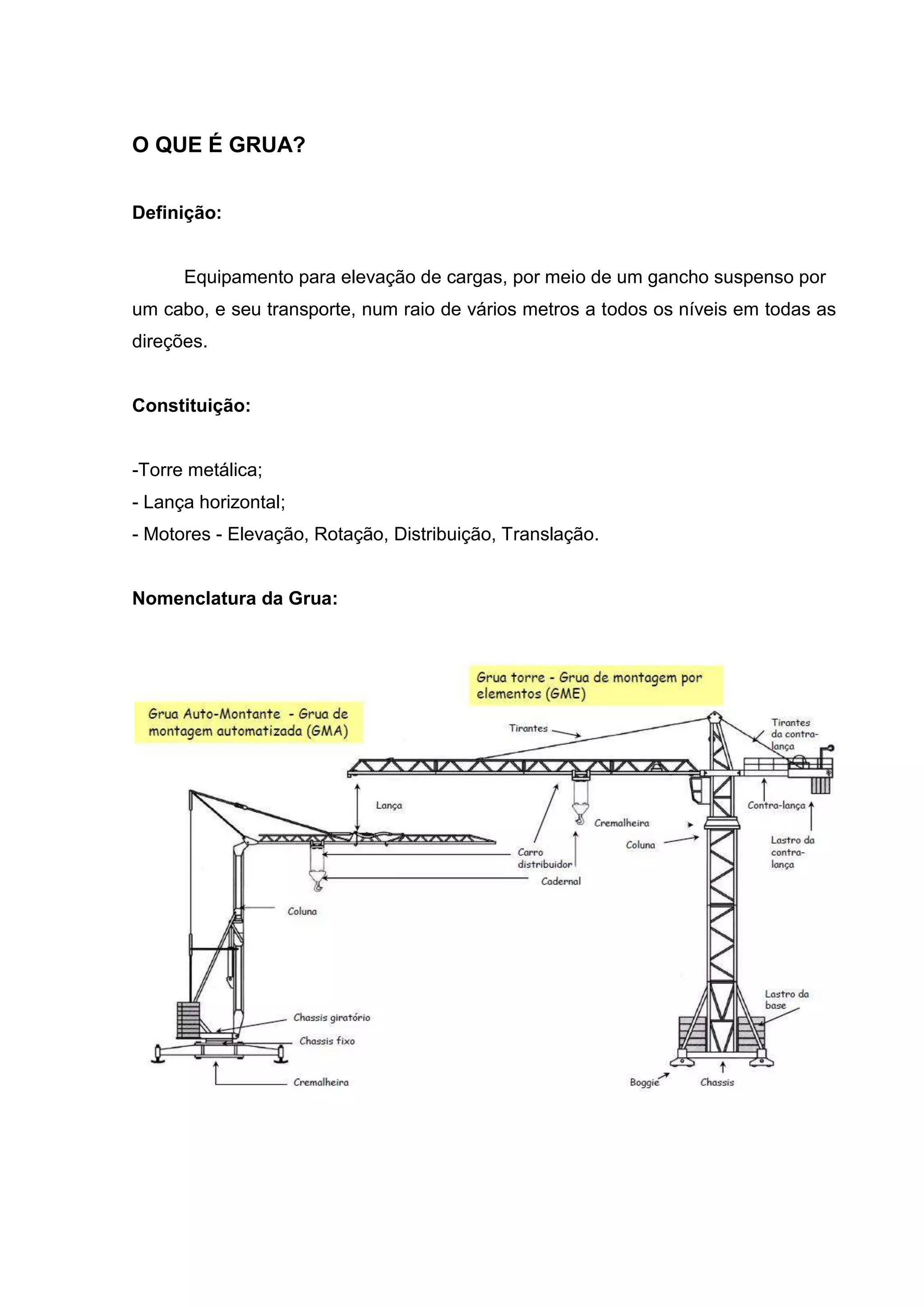 Uma grua é um equipamento que eleva e transporta cargas usando um gancho suspenso por um cabo. Ele consiste em uma torre metálica, uma lança horizontal e motores para elevação, rotação, distribuição e translação. As gruas permitem mover cargas em todas as direções e níveis.