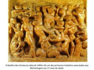 Michelangelo foi um artista renascentista italiano multifacetado, destacando-se como pintor, escultor e arquiteto. Ele é conhecido por obras como a Pietà, o Davi e os afrescos da Capela Sistina, onde pintou o Juízo Final. Michelangelo teve profundos estudos anatômicos e foi precursor do Barroco na Itália.