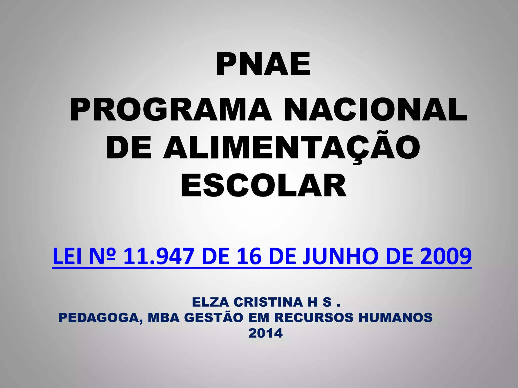 Este documento descreve a Lei no 11.947 de 2009, que estabelece diretrizes para o Programa Nacional de Alimentação Escolar (PNAE). O PNAE tem como objetivo promover a alimentação escolar saudável e adequada para estudantes da educação básica pública, por meio da oferta de refeições nutricionalmente balanceadas durante o período letivo. A lei define responsabilidades da União, Estados e Municípios na execução do programa.