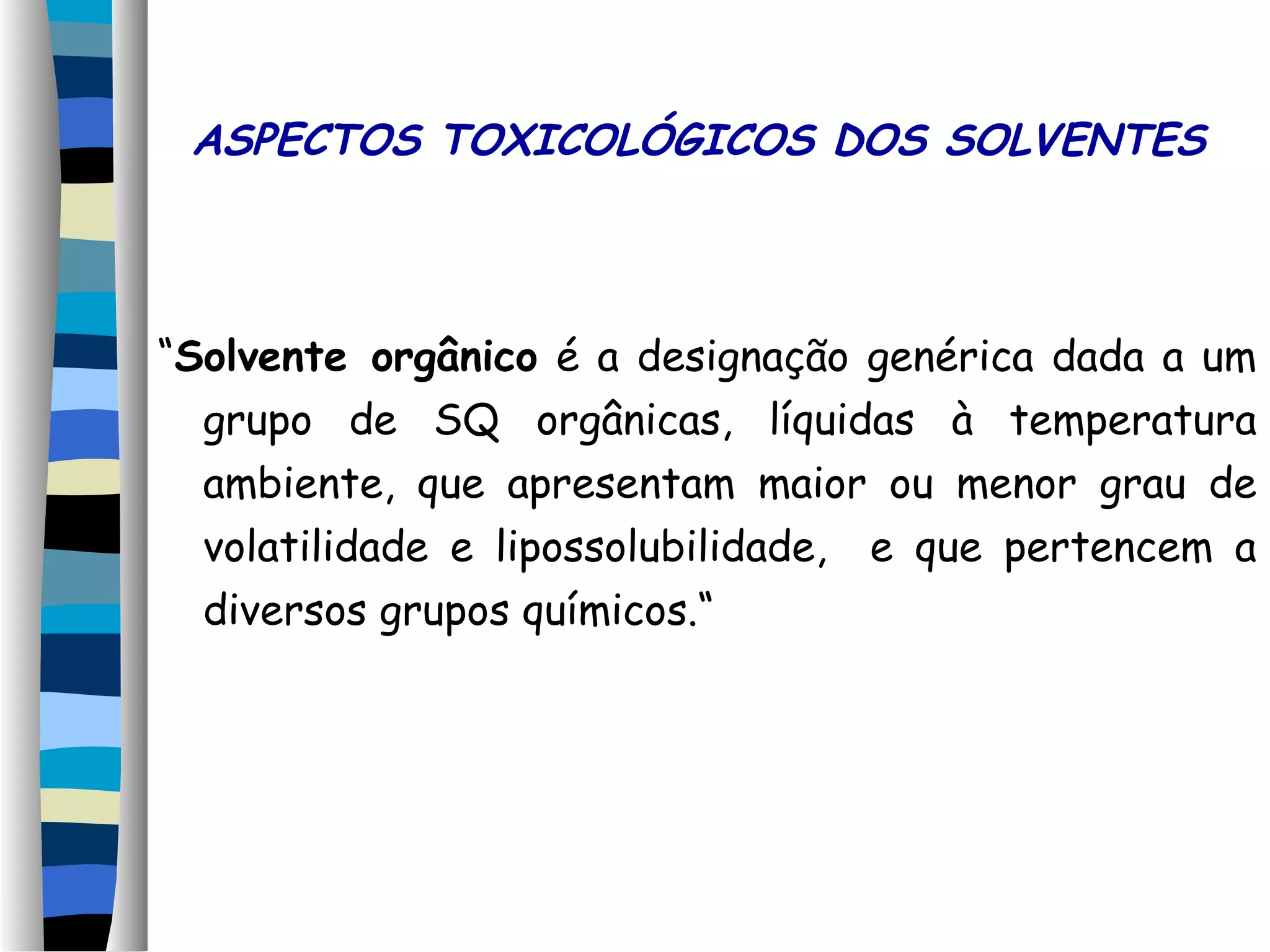 O documento discute aspectos toxicológicos de solventes orgânicos comumente usados em ambientes ocupacionais. Apresenta classificações químicas de solventes, fatores que influenciam sua toxicidade, vias de absorção, distribuição e eliminação no corpo, efeitos agudos e crônicos na saúde, e medidas para monitoramento e controle da exposição ocupacional.